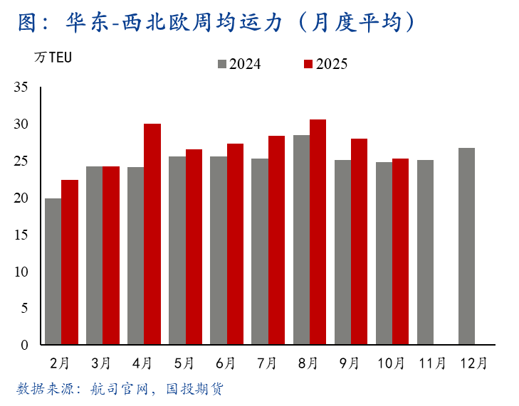 但值得注意的是,这种高增长并非所有商品类别“全面开花”。 综合货代及船公司反馈,对西北欧地区出口表现亮眼的典型货种包括纺织服装品、轮胎、机械设备、家电、木质家具,以及在前几年表现究颇为引人注目的新能源电动汽车和锂电池等新能源类货物。通过调研分析,我们认为以下几类因素共同推动了欧洲对某些商品进口的显著增长: 成本因素:欧洲能源价格高位等成本因素,削弱了其工业品制造竞争力,而中国出口产品在性价比上具备优势,例如轮胎和部分传统机械设备。此外今年欧元兑人民币的汇率表现也支撑出口的韧性。 出口目的地转移:今年美国加征对等关税显著提高了中国产品出口美国的成本,促使部分出口商转向欧洲市场。例如纺织服装品类对美出口大幅下滑,而对欧盟出口实现较快增长。 政策驱动的抢运行为:典型代表有欧盟《森林砍伐监管条例》(EUDR)新规即将生效,也刺激了家具等品类提前备货。 环境因素拉动:今年欧洲夏季高温天气带动了空调、冰箱等家电产品对欧出口的增长。这反映出,当出现突出的商品需求时,中国凭借高性价比和强大制造能力,能够有效承接较大规模的补库需求,这一逻辑也适用于其他商品类别。