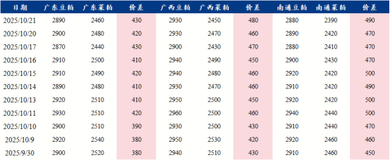 据Mysteel对国内主要油厂调查数据显示:2025年第42周,全国主要油厂大豆库存上升,豆粕库存下降,未执行合同下降。其中大豆库存768.7万吨,同比去年增幅27.49%;豆粕库存97.62万吨,同比去年增幅4.16%;国内豆粕库存规模同比往年处于历史偏高区间,高库存不仅直接削弱了供应端的稀缺性支撑,还导致油厂面临一定的仓储与资金周转压力,为缓解库存积压,部分油厂不得不通过小幅下调报价吸引采购,但市场响应有限,供应端的宽松格局短期内难以扭转,持续对豆粕价格形成压制。与此同时,豆粕价格持续低位运行,与菜粕的价差过窄,致使菜粕的替代性价比优势尽失。此消彼长之下,饲料企业普遍倾向于增加豆粕用量,挤压菜粕需求,进而对菜粕整体消费形成强劲压制。 综上所述,四季度是菜粕的传统消费淡季,其核心驱动在于水产养殖随气温下降而进入淡季,菜粕的主力需求—水产料消费随之呈现断崖式下滑。另一方面,替代品豆粕价格持续处于低位,且与菜粕价差过窄,使菜粕在饲料配方中毫无性价比优势,反而面临被豆粕进一步替代的压力。水产需求的季节性萎缩与蛋白粕的替代效应叠加,共同制约菜粕消费,预计将压制其未来价格的上方空间。 七禾带你去调研,最新调研活动请扫码咨询