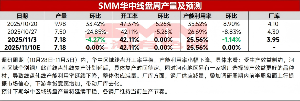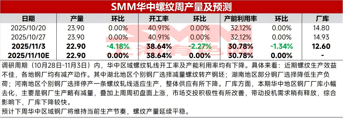 | 报告品种:螺纹钢 原文链接:https://mp.weixin.qq.com/s/HWAEH7RMBhrhejwAgAPryw 调研周期(10月28日-11月3日)内,华中区域钢厂螺纹轧线的开工率及产能利用率均下降;线盘轧线开工率平稳,产能利用率小幅下降。