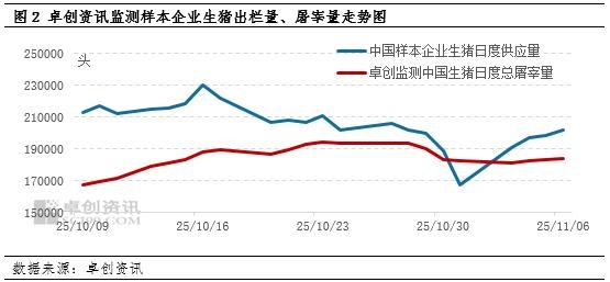 11月初需求平稳 供应增加 从需求端看,从10月底到11月初,生猪屠宰量运行趋势相对平稳。11月6日,卓创资讯监测生猪屠宰量为18.41万头,较四个工作日前仅微幅增加,对生猪价格影响较小。从供应端看,11月初养殖企业日度出栏量持续增加,11月6日,卓创资讯监测样本企业日度出栏量为20.18万头,四个工作日累计增加3.47万头,利空生猪价格。