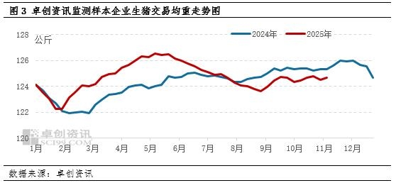 从10月份开始,部分养殖企业看跌后市,已开始冲量动作。从交易均重季节性看,四季度气温较低,生猪生长速度加快,生猪交易均重多上升,卓创资讯监测2021-2024年10月中旬到11月上旬生猪交易均重多呈上升态势,过去五年平均上升1.28公斤。但2025年11月6日生猪交易均重为124.65公斤,交10月中旬基本持平,表明养殖企业有降低体重、加速出栏动作,支撑供应增加,利空生猪价格。
