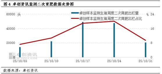 11月二次育肥热度下降 10月中旬猪价降至相对低位后,二次育肥热度提升,随着猪价上涨、二次育肥补栏进度基本完成,热度于10月底开始下降,10月31日卓创资讯监测样本企业周度二次育肥占比为9.45%。据卓创资讯调研,进入11月后,二次育肥热度同样较为平淡,对猪价的支撑力度减弱。