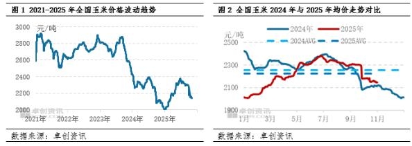 | 【导语】2025年国内玉米价格整体表现为以7月为分界点先涨后跌的倒“U”型走势,价格上涨的根本原因是供应收紧、需求提升。受政策以及新季玉米上市影响,7月份以后市场供应增加,而需求支撑力度有限,市场价格承压走低。 2025年玉米价格先强后弱 近五年,国内玉米价格呈先高位振荡再下跌的趋势。2020年随着国内玉米市场去库存逐步结束,供需收紧,玉米价格持续上涨,2021年3月达到近五年价格最高点2925元/吨,此后小麦等替代品价格优势开始显现,替代品消费量增加,玉米消费量减少,玉米价格逐步回落。2022-2023年在阶段性供需关系调整下,玉米价格维持区间内盘整状态。2024年市场供大于求矛盾逐步凸显,玉米价格跌幅明显,其中12月市场价格最低跌至2006元/吨,较近五年最高点下跌919元/吨,最大跌幅31.42%。由于2025年玉米产量下降,而下游饲用需求增加,市场价格低位反弹,最高点涨至2360元/吨,最大涨幅17.65%。