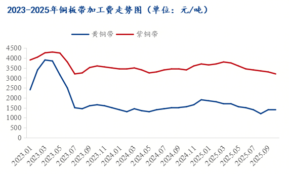 | 报告品种:铜 原文链接:https://mp.weixin.qq.com/s/r-PXxiAlKeJQ3cGK0eFOMQ 一、紫铜板带加工费小幅下滑,黄铜板带加工费报价企稳 10月紫铜板带加工费较9月小幅下降,虽期间短期内有向上波动,但整体延续着今年持续下降的趋势。铜价走高使得紫铜板带价格重心上涨明显,下游采购节奏有所放慢,厂家出货压力加大,部分厂家以及贸易商被迫让利加工费。同时华东地区部分新增产能开始释放,市场新增低价报盘,使得整体加工费承压下滑。但相比于此前大幅波动,本月铜板带整体供应下滑,铜厂库存低位,使得加工费虽有下调,但整体调整幅度并不明显。