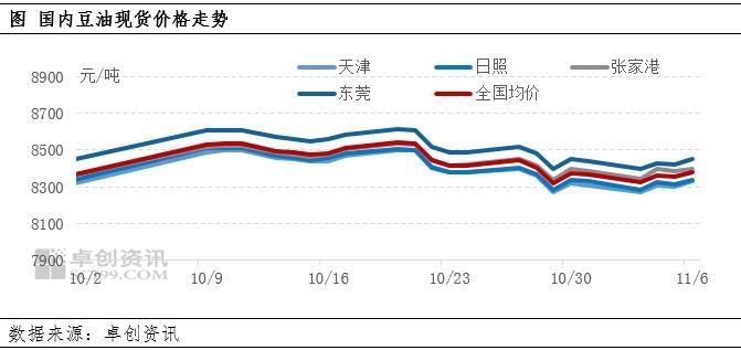 | 【导语】上周受到马来西亚棕榈油累库的影响,豆油跟随相关品下滑;但因国际大豆持续几日涨价及国内企业挺价支撑,跌幅受限。因国内豆油库存压力有限,加之局部企业有停工计划,预计下周豆油市场或小幅回升。 上周豆油价格下滑 周内市场受到马来西亚棕榈油累库影响,豆油跟随棕榈油承压下滑;之后因国际大豆持续涨价从成本端给予支撑,且国内市场挺价意愿强,限制了价格跌幅。截至上周四(11月6日)收盘,国内一级豆油价格8378元/吨,环比涨3元/吨,幅度0.04%;周度均价8358元/吨,环比下跌35元/吨,幅度0.42%。