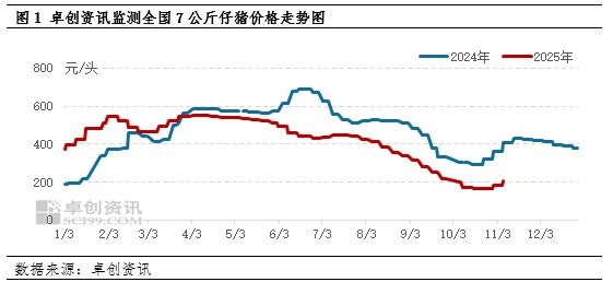 | 【导语】10月下旬起,7公斤仔猪价格止跌反弹,据卓创资讯监测,截至11月7日,全国7公斤仔猪均价已攀升至207.19元/头,与10月中旬相比上涨41.52元/头,增幅为25.06%。这一反弹行情是生猪价格回暖带来的需求提振,与集团场因亏损而收缩供应的双重推动。综合当前市场形势来看,卓创资讯预计未来1-2个月内,7公斤仔猪价格仍具备小幅上涨的空间。 近半月7公斤仔猪价格止跌反弹,涨幅为25.06% 近期,国内7公斤仔猪市场迎来重要转折,自10月下旬起,结束了7月中旬以来仔猪价格持续下滑的局面。目前已开启止跌反弹模式,且涨幅超出市场预期。这一波仔猪价格反弹,一方面是生猪价格上涨带动下游补栏情绪好转;另一方面在于养殖集团面临仔猪销售亏损有惜售情绪,自留量增加,市场仔猪供应减少,从而提振仔猪价格。
