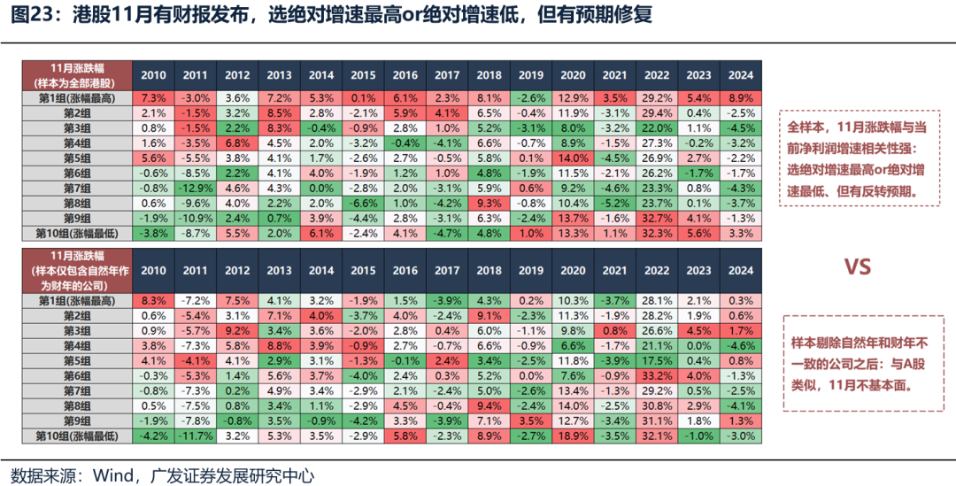四、配置上,11月基本面驱动效应强,仍然采用杠铃策略,以红利为底仓,科技成长博弹性 (一)不同于A股,港股的11月基本面驱动效应强 1.与A股市场类似,在港股市场上,景气投资始终有效,港股中长期驱动因素是盈利,业绩越好的公司,涨幅也越大。 (1)将全部港股公司分为十组,第1组代表EPS增速最大的公司,第10组代表EPS增速最低的公司,里面每一个带颜色的数字,都代表该组公司在该年的涨跌幅中位数。 (2)我们回溯了诸多财务指标(如增速、盈利、估值、现金流、股息率等),从单因子有效性来看,在过去30年,最有效的仍然是业绩的一阶指标,比如净利润增速、营收增速、ROE变化率等。也就是说从单因子角度,相对景气度的高低决定相对收益的高低。 (3)不管市场是牛市、熊市、还是震荡市,不管风格是蓝筹还是成长,也不管板块轮动是快还是慢,一年维度的涨跌幅基本与当年的景气度呈现单调正相关的情况,即业绩前30%的个股当年涨跌幅要远好于业绩后30%的个股。 2.与A股市场不同的一点是,港股11月是相对比较基本面的,炒业绩高增长或者业绩特别差有预期预期的公司。背后原因是,港股仍有不少公司,自然年和财年不一样,会在11月发布财报,例如阿里巴巴等。 (1)类似地,将全部港股公司分为十组,第1组代表EPS增速最大的公司,里面,里面每一个带颜色的数字,都代表该组公司在11月的涨跌幅中位数。 (2)从全样本看,11月涨跌幅与当前净利润增速相关性强,选绝对增速最高、或者绝对增速最低、但有预期预期的公司,即便是2014-2015年流动性驱动的牛市,在11月基本面更好的公司普遍涨幅也更高。 3.如果把自然年和财年不一样的公司剔除,就和A股类似,11月炒基本面的效应相对不明显。