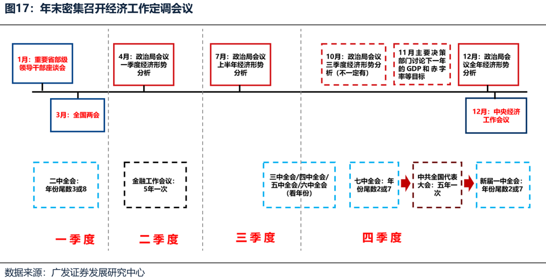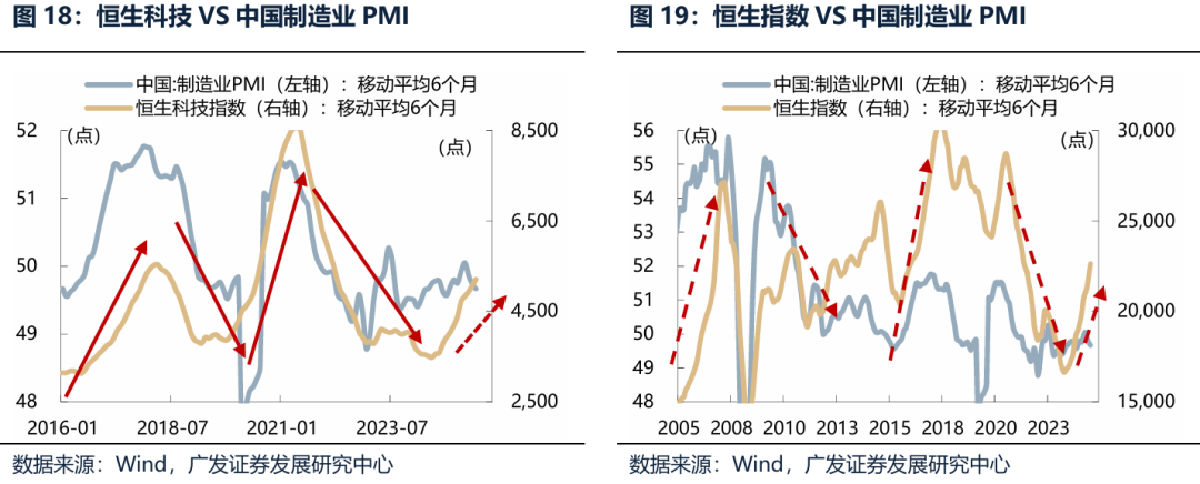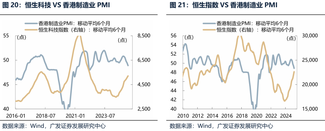 (三)Trigger 3:如果年末政策推动传统行业业绩预期修复 2021年以来经济走势清晰呈现了“U型经济”的典型特征,其本质是政策逆周期调节的精准发力:每当年中经济总量出现下滑时,年末或次年初通过财政政策、货币政策或产业政策及时托底,推动经济从下滑区间进入企稳回升通道,形成“经济下滑-政策发力-企稳回升”的U型轨迹。 2021年:Q2-Q3受疫情汛情双限等因素影响,经济呈现下滑压力,Q4政策端发力托底,对于“一刀切”供给约束纠偏,年末经济企稳。 2022年:三季度经济失速下滑;Q4防疫放开叠加政策发力,次年年初经济企稳。 2023年:Q2-Q3处于“经济强预期、弱现实”的阶段,经济表现承压;Q4通过通过增发国债、推进“三大工程”等财政货币政策的发力,经济在四季度企稳。 2024年:Q2-Q3受消费疲软、基建下滑等因素影响,经济面临下行压力。Q4地产领域“两重”“两新”政策持续生效,推动经济在四季度企稳。 2025年:Q3开始社融低于预期,二季度开始经济呈现下滑迹象。随着美联储重启降息周期、中国货币政策空间打开;年末十五五规划推出、密集召开经济工作定调会议,提振政策预期,有可能会推动传统行业的业绩预期修复。 港股市场中内资企业占比超过70%,收入和利润主要来自中国内地经济,年末政策推动传统行业业绩预期修复,也有助于恒生指数和恒生科技指数继续上涨。作为一个验证,我们可以看到恒生科技和恒生指数的走势与中国制造业PMI高度一致,但是和香港制造业PMI基本关系不大。