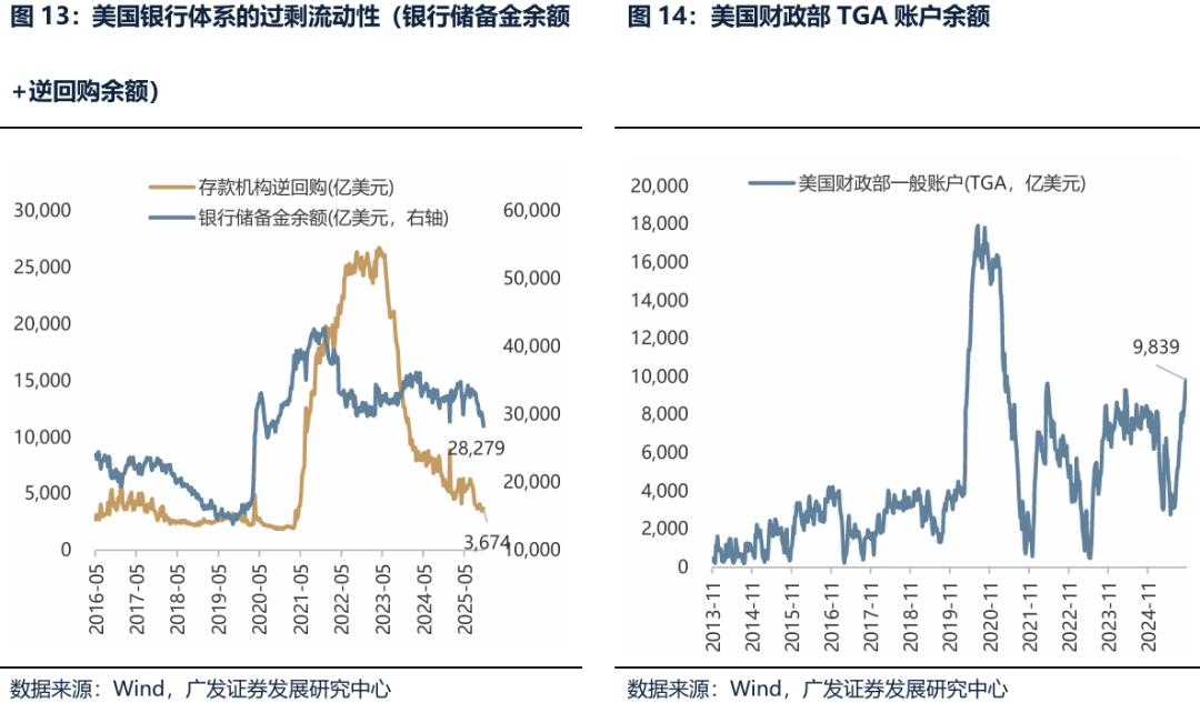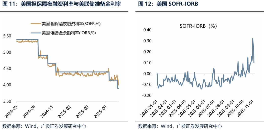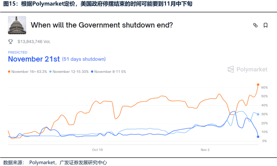 (二)Trigger 2:如果美国政府停摆结束、美联储停止缩表甚至重启扩表,美元流动性得到缓解 近期美国SOFR(担保隔夜融资利率, “借钱成本”)与IORB(美联储准备金利率,“存钱收益”)的利差显著扩大,美元短期流动性紧张。 10月31日,SOFR升至4.22%,较IORB(3.9%)高出32个基点,创下2020年3月以来最大单日利差; 11月3日,SOFR回落至4.04%,但仍较IORB高出14个基点; 11月5日,全球资产的避险情绪进一步发酵,加股市大跌,美债利率上行,美元指数上升,加密货币大跌,黄金、白银、铜价下跌。 造成本次紧流动性收紧的原因有多种: 第一,美联储缩表、叠加财政部发债回补TGA,导致银行体系的过剩流动性(银行储备金余额+逆回购余额)降至2021年以来的最低水平; 第二,政府关门,短期可能因无法支出,导致财政存款TGA余额上升(接近万亿美元,大于22-23年的中枢7000-8000亿美元)。 近期已经出现好转现象:11月7日,美国参议院少数党领袖、民主党人查克·舒默表示,鉴于多次投票未能结束政府“停摆”,民主党提出一项新的妥协方案,主张同时重启政府运作,并提议将《平价医疗法案》补贴延长一年。市场开始预期未来美国政府停摆僵局将会得到打破。截至2025年11月8日,根据Polymarket定价,美国政府停摆结束的时间可能要到11月中下旬。 如果后续美国政府停摆结束、美联储12月降息表态重新转鸽、美联储停止缩表甚至重启扩表,美元流动性得到缓解,港股可能会出现新一轮上涨。
