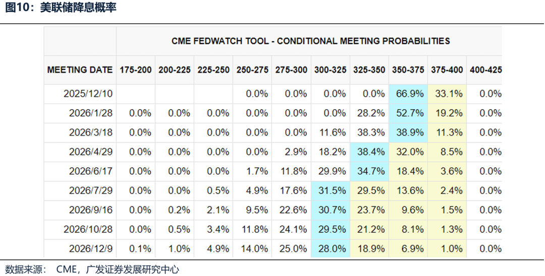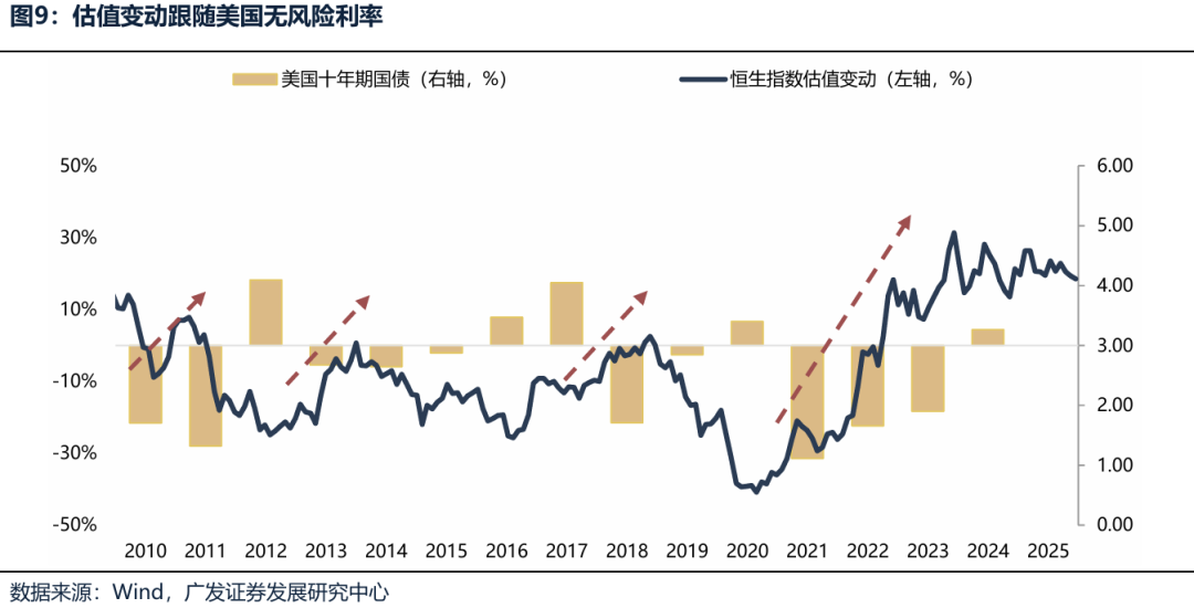 三、港股下一阶段上涨Trigger 结论:目前美联储降息表述偏鹰(12月降息概率降至66.9%),并且受到美国政府停摆、美联储缩表等影响,近期美国SOFR(担保隔夜融资利率, “借钱成本”)与IORB(美联储准备金利率,“存钱收益”)的利差显著扩大,美元短期流动性紧张。如果出现流动性预期改善(12月降息表态转鸽、美国政府停摆结束、美联储停止缩表甚至重启扩表,美元流动性得到缓解)或者是年末政策推动传统行业业绩预期修复,那么港股迎来新一轮上涨机会,例如今年以来港股8-9月上涨(重启降息)、4.2(关税暂停南向大幅流入)、1-2月(南向、外资同时大幅流入港股)。 (一)Trigger 1:如果12月美联储降息表态再度转鸽 目前美联储降息表述偏鹰(12月降息概率降至66.9%),一旦有所扭转,就是港股新一轮上涨的起点。 (1)历史上看,恒生指数估值变动与美国10年期国债收益率的变动在多数时期呈负相关性,每一次美国10年期国债收益率快速拉升,例如2021-2023年、2018年、2011年,估值对恒生指数均是负贡献。 (2)今年以来效应尤其明显,8-9月上涨(重启降息)、4.2(关税暂停南向大幅流入)、1-2月(南向、外资同时大幅流入港股),都对应着港股新一轮上行机会。 (3)此外,虽然明年年中才会有鸽派美联储主席上台,但由于贝森特不满鲍威尔对12月降息的鹰派表述,表示将于12月初启动第二轮面试,遴选接替现任美联储主席鲍威尔的人选,以便特朗普能在圣诞节前确定新任主席。