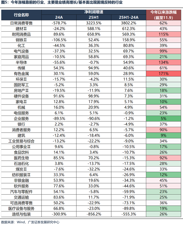 当前净利润增速和涨幅看似分叉,实则不然,本轮港股上涨是有较强基本面支撑。 一方面,传统行业和新兴产业出现明显业绩分化,新兴产业迎来爆发式增长,港股整体业绩增速主要受到传统行业拖累。传统行业例如地产、基建、消费、金融等,受到财政力度、PPI的拖累,净利润增速下行,拖累港股整体的净利润增速下行。然而,新兴产业、先进制造业,例如新能源、AI、有色金属、钢铁、半导体等具备全球竞争优势的行业,今年以来业绩增速明显加速上行。 另一方面,行业涨幅也出现明显分化,有业绩支撑的行业,涨幅更大,支撑指数整体上涨。今年以来涨幅靠前的主要是有业绩支撑的新兴产业/先进制造业,拉高的港股整体指数的涨幅,而对于业绩增速继续回落的行业,今年以来涨幅普遍较小,部分涨幅较大的行业,普遍是存在业绩好转预期,例如港股创新药license-out持续落地、互联网业绩虽然短期受到外卖补贴的冲击,但AI驱动云计算板块超预期。
