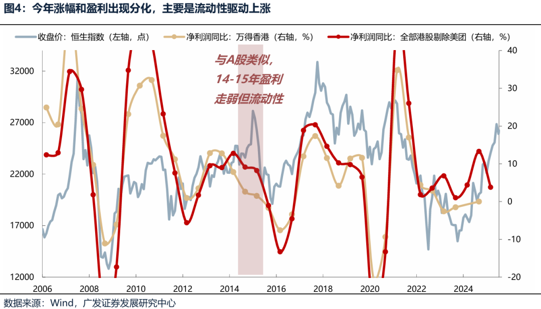 二、本轮港股上涨没有基本面支撑吗? 从长时间序列上看,港股走势主要由企业净利润增速的方向所驱动,仅有2014-2015年虽然净利润增速走弱但在增量资金驱动下,指数继续上涨。四万亿计划刺激下,恒生指数2009年净利润由负转正并上行时,指数走势同步上行。2016-2017年中美经济复苏共振,恒生指数净利润增速触底反弹,指数走势也触底后再度走强。而2024年经济复苏,恒生指数净利润增速自低位转正抬升,指数跟随业绩开始低位反弹。