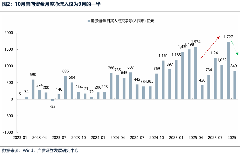 但是,到了10月,前期利好因素开始扭转,港股流动性阶段性承压,对市场利好钝化、利空敏感。 一方面,10月FOMC会后,美联储再度鹰派表述,12月降息的概率从95%暴跌至65%;美国联邦政府关门、美联储缩表、叠加财政部发债回补TGA,导致银行体系的过剩流动性(银行储备金余额+逆回购余额)降至2021年以来的最低水平,美国流动性危机的担忧升温;叠加近期南向资金流入放缓,10月净流入仅为过往9月的一半,港股流动性阶段性承压。 另一方面,前期基本面利好已在9月兑现,当前经济高频数据修复力度偏弱,政策端也未出现超预期的刺激措施,科技成长板块在经过二、三季度的轮动上涨后,对利好反应趋于钝化,而对外围摩擦、行业监管等利空因素更为敏感。 因此,资金流向防御性较强或者前期涨幅落后的板块和公司,10月涨幅前五的行业均是高股息行业,如石油石化、煤炭、银行、交运、公用事业。增量资金有限情况下,存量资金开始出现高低切,作为一个印证,可以看到南向资金10月净流出的主要是前期涨幅最大的中芯国际、阿里巴巴,均有80亿以上净流入;而前期超跌的美团、小米在10月都有南向资金50亿以上的净买入。