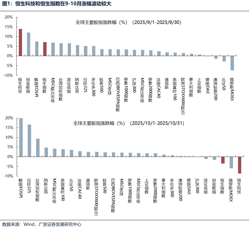 | 一、恒生科技为何近期波动较大? 9月港股市场放量上涨,主要由于资金面的利好以及行业基本面的改善。 9月恒生指数和恒生科技分别上涨7.1%和13.9%,涨幅位居全球主要股指前列。一方面,中报过后港股互联网业绩利空出尽、市场开始逐步预期AI驱动的广告及云服务有望成为新的增长点,而A股部分行业估值偏高导致部分资金存在高低切的需求,南向资金积极涌入港股;另一方面,过往历次美联储重启降息,港股表现均较好,重启降息后一年,恒生指数平均涨幅35.4%,美联储在9月18日开启新一轮预防式降息,港股迎来新的配置窗口期。 行业层面,9月香港市场可选消费零售(30.9%)和电气设备(30.3%)领涨。 (1)可选消费零售主要受到业绩超预期的阿里巴巴驱动,外卖补贴大战还未在2026财年一季报显现,而AI驱动的广告及云服务有望成为新的增长点。 (2)电气设备主要受到以宁德时代驱动,储能的国内外需求持续超预期,产业链出货上修,上游供需紧张加剧下涨价意愿增强,带动板块需求、盈利预期抬升,市场在需求上可能存在显著预期差,集成厂业绩已开始逐步兑现。