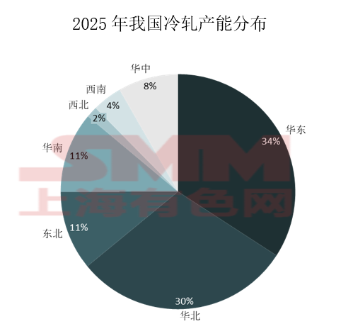 数据来源:SMM 破局“东材西运”需长期规划 从冷轧产能分布来看,华东和华北地区冷轧产能超60%,是冷轧两大产能集聚区域,牢牢把握供给主导权;华南与东北规模紧随其后,但规模仅占华东和华北的三分之一;华中、西南、西北三者相加不足15%,产能密度低,但制造业需求较多,是较为明显的冷轧资源输入地。整体来看,冷轧产能集中在长江与沿海地区,西部地区边缘化严重。 展望未来,随着西部地区汽车、家电的集聚及发展,需求带动冷轧产能向西偏移,且在《西部地区鼓励类产业目录(2025年本)》中支持电炉生产,但高炉仍需遵循产能置换要求,“东材西运”格局的改变仍需要长期的规划。