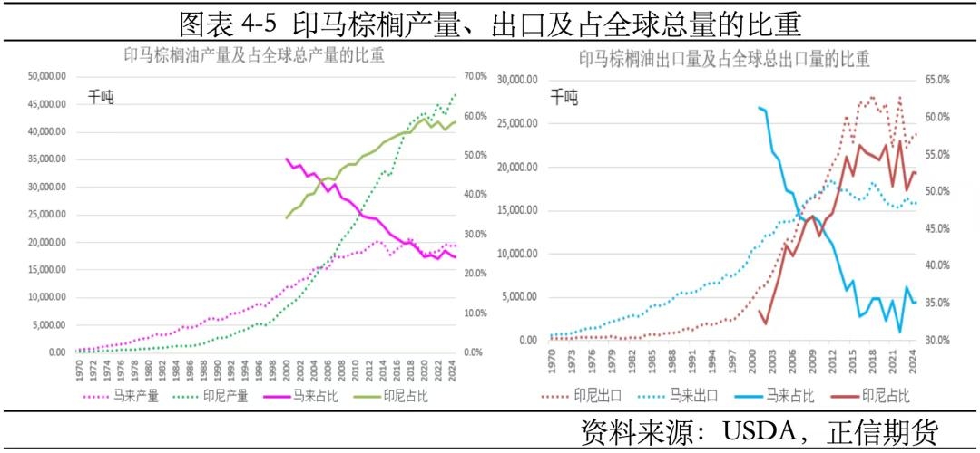 棕榈油生产和供应高度集中。油棕原产于非洲西海岸,19世纪70年代之前非洲贡献了大部分棕榈油,其中以尼日利亚和刚果(金)为主;随着油棕种植向东南亚扩展,1970年马来西亚超过尼日利亚成为全球第1大棕榈油生产国,并一直持续到2005年被印度尼西亚超越。20世纪80年代,东南亚棕榈油产量已超过非洲,目前印马两国棕榈油产量占全球总产量的比重高达83%,两国同样也是棕榈油主要的出口供应国,占全球棕榈油总出口的85%以上,掌握全球棕榈油定价权。 产量看,马来产量扩张早于印尼,20世纪末已达1000万吨,且经过40年的扩张至2017年达到峰值2000万吨,此后产量趋于稳定;印尼起步较晚,20世纪90年代进入快速发展期,至今仍未达到产量高峰,且在2005年超越马来成为全球第一大棕榈油生产国。两国棕榈油产量在全球总产量中的比重此消彼长,马来占比从21世纪初的50%降至当前的25%左右,与之相对的印尼占比则从34%升至58%左右。 出口看,马来人口偏少对棕榈油消费需求不高,出口伴随着产量扩张而增加,21世纪之前马来出口占全球棕榈油总出口量的60%以上,不过近10年随着马棕产量止增,其出口亦稳定在1550-1750万吨;印尼方面,棕榈油出口量稍后于产量也出现陡崖式上升,并在2011年超越马来成为全球第一大棕榈油出口国,近10年其国内生柴需求增加挤占部分出口份额,印尼棕榈油出口高位回落。两国棕榈油出口在全球总出口量中的比重同样此消彼长,马来占比从21世纪初的60%以上降至当前的35%左右,与之相对的印尼占比则从30%左右升至50%以上。
