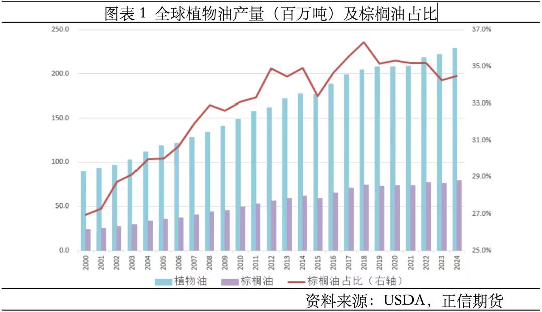 | 棕榈油是全球产量和消费量最大的植物油品种,其生产和供应高度集中于东南亚地区,供给垄断格局使得印马分别通过“能源锚点”和“金融基准”掌控着全球棕榈油定价权,二者竞争的同时又互补共存。中国、印度、欧盟作为棕榈油主要消费地,通过需求结构和政策调整向产区反向传导,阶段性主导棕榈油价格走势。 一、全球棕榈油生产及供应高度集中 油棕是世界著名的热带油料树种,其果实含油量非常丰富,每公顷植物油年产量约为大豆的10倍、油菜籽的5倍、向日葵的7倍,享有“世界油王”之称。棕榈油由棕榈果压榨而成,是全球产量和消费量最大的植物油品种,近30年全球棕榈油产量大幅扩张,从20世纪90年代的1500万吨到当前的8000万吨,涨幅高达433%,其在全球植物油总产量中的比重一路攀升至35%以上。