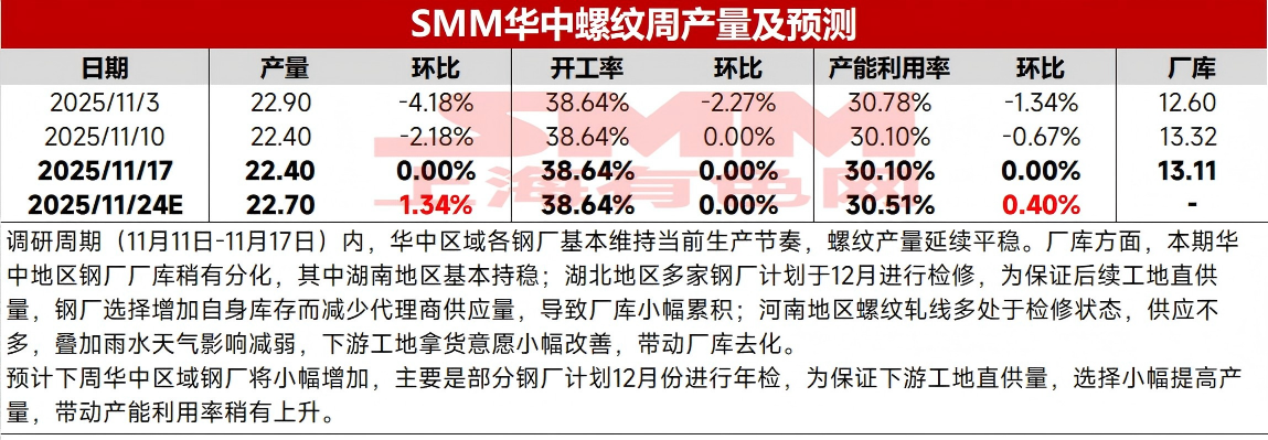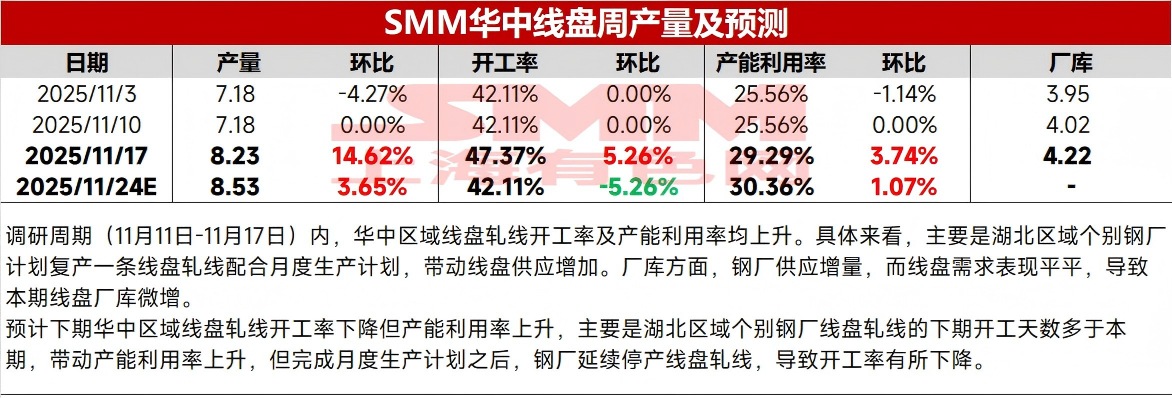 | 报告品种:螺纹钢 原文链接:https://mp.weixin.qq.com/s/i_Ul0eF_Fm3M-judX0Zaog?scene=1&click_id=2 调研周期(11月11日-11月17日)内,华中区域钢厂螺纹轧线的开工率及产能利用率均持稳;线盘轧线开工率及产能利用率均上升。