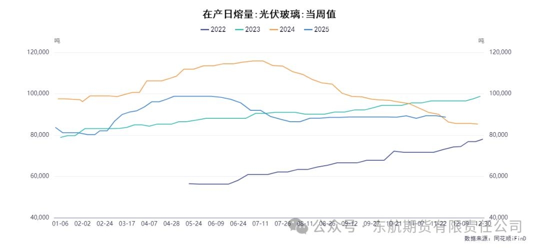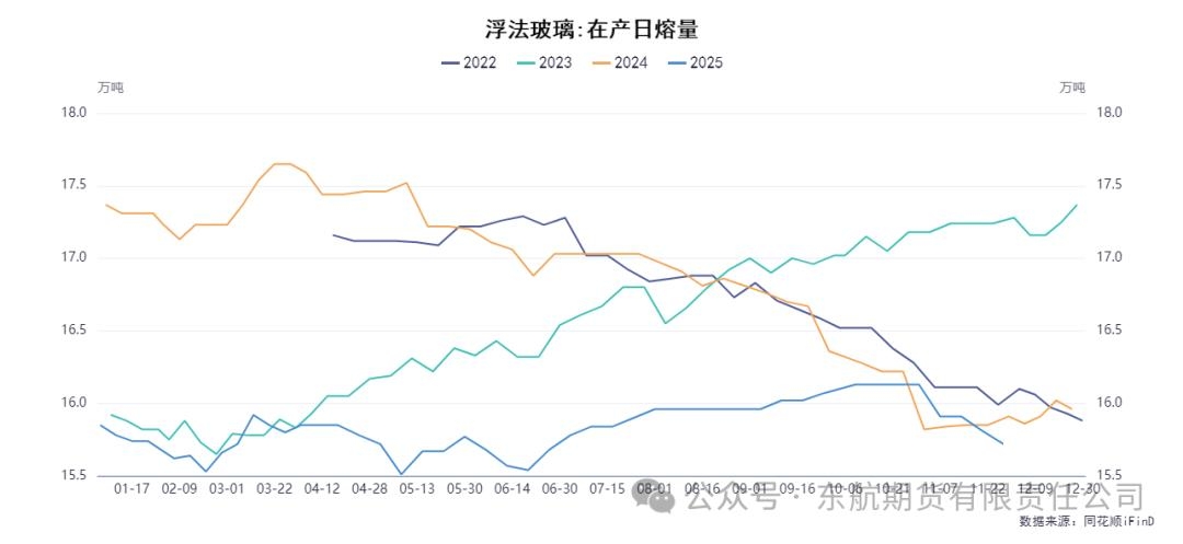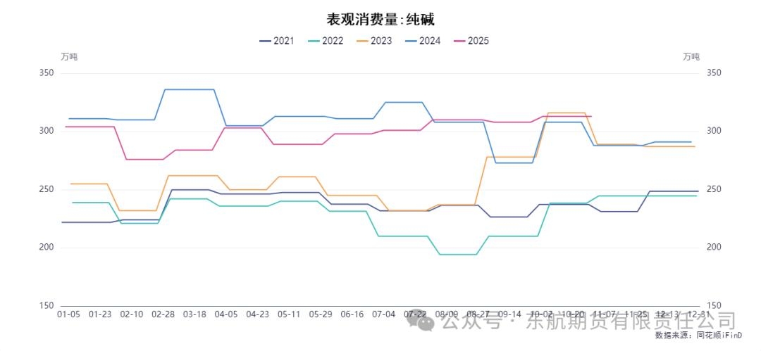 二、 需求端分析:浮法玻璃冷修主导需求转弱,轻碱平稳难挽颓势 当前纯碱需求端呈现出分化,重碱的下游主要集中在浮法玻璃和光伏玻璃。数据显示,近期浮法玻璃行业冷修加速,国内浮法玻璃生产线在产条数减少,日熔量环比下降0.57%至15.72万吨。玻璃企业受利润及库存压力影响,对纯碱维持刚需采购,且随着日熔量下降,未来的采购量存在进一步缩减的预期。光伏玻璃方面,日熔量相对稳定但已开启低位累库,对重碱的需求亦难有增量提振。 轻碱需求方面,表现相对稳定。其下游应用领域(如洗涤、化工、食品等)采购有一定回暖,局部地区供应甚至出现偏紧迹象。这使得轻碱库存去化速度相对较快,为市场提供了一定的结构性支撑。然而,轻碱在整个纯碱消费结构中的占比小于重碱,其需求的平稳无法对冲重碱需求萎缩带来的总量下滑。综合来看,纯碱整体表观消费量增长减缓,需求端走弱的趋势已成定局,且随着时间推移,若浮法玻璃冷修范围扩大,这一负反馈效应将更加明显。