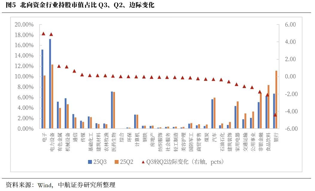 我们通过北向资金季度行业持股市值占比以及边际变化,来观察本轮北向资金青睐的行业方向。三季度北向资金重仓的前五大行业分别为电力设备、电子、医药生物、银行、食品饮料 ,分别占北向资金持股全部行业总市值的17.19%、15.17%、7.12%、6.73%、6.29%,电力设备和电子的优势显著,领先排名第三的医药生物一倍有余。从边际变化来看,北向资金三季度较二季度主要加仓中国的科技方向,前五大加仓行业分别为电子、电力设备、有色金属、机械设备、通信,持仓比例分别较二季度提升4.96pcts、4.88pcts、1.21pcts、1.14pcts、0.65pcts。其中,电子和电力设备在二季度便均为北向资金重仓方向,三季度延续位居前列,且边际加仓亦居榜首,显示出外资对中国科技方向的持续看好,对中国科技资产认可度进一步提升。