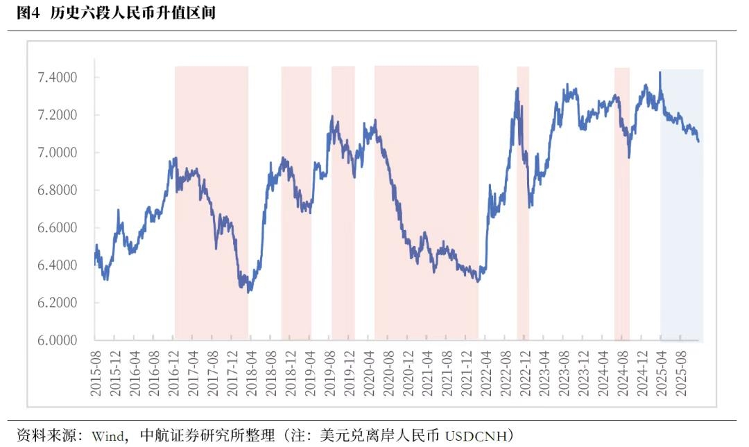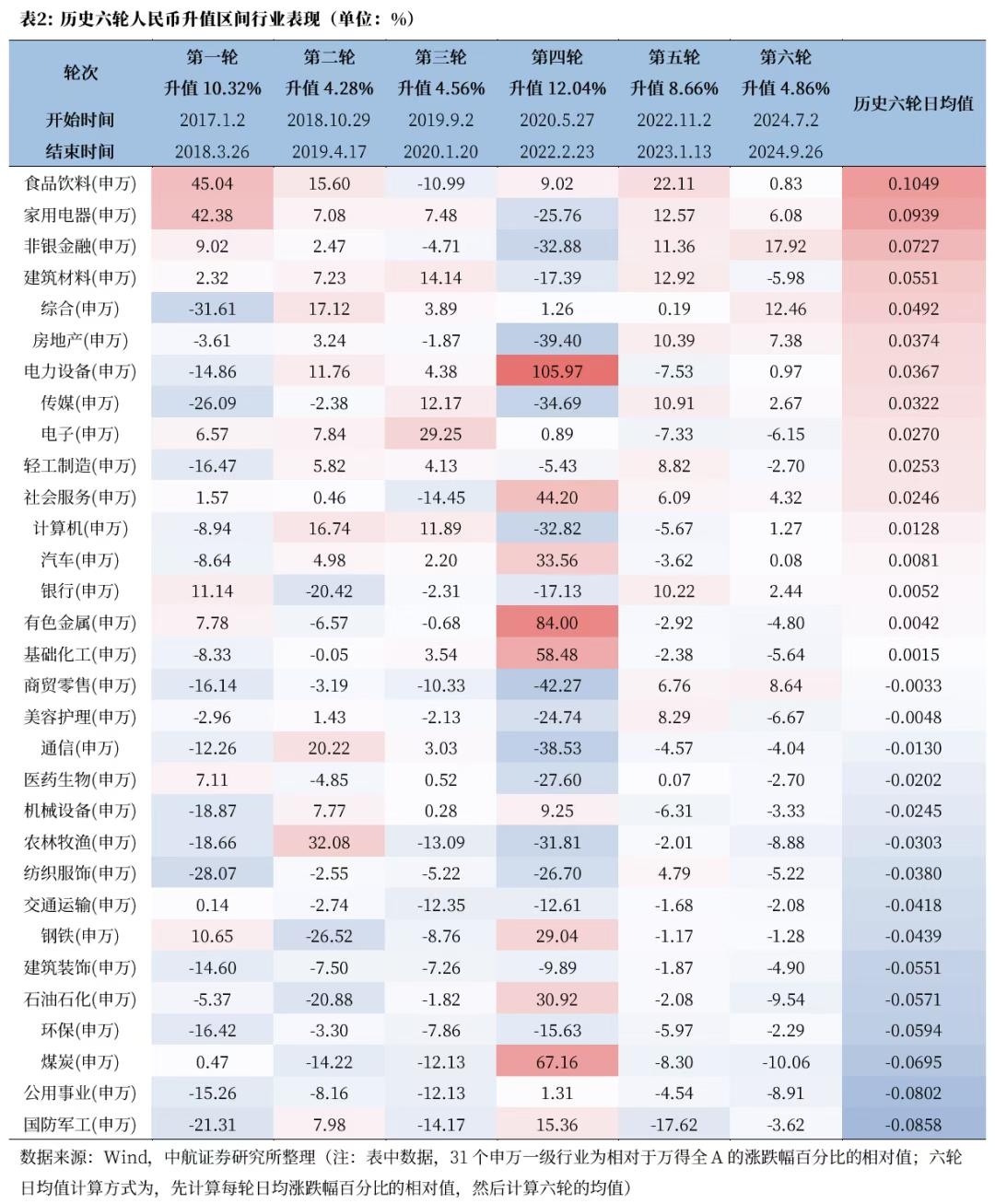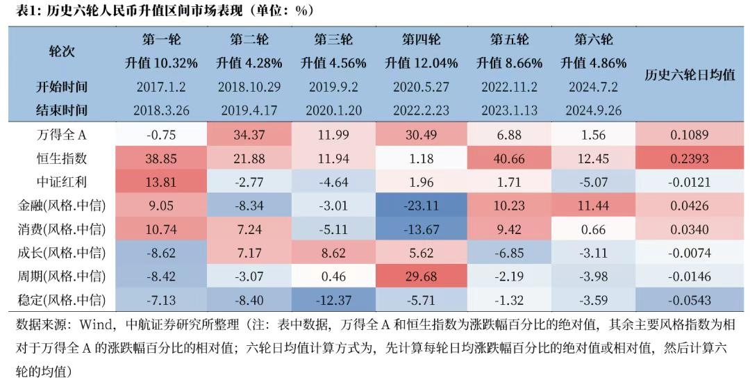 过去六轮人民币升值区间中国股票市场胜率高,A股、港股多数表现为上涨。其中,港股略强于A股。A股结构上,平均来看,金融、消费风格占优,食品饮料、家用电器、非银金融等行业具有较为明显的相对优势,更受外资青睐。统计人民币升值趋势较为明显的六轮历史区间,A股、港股多数表现为上涨。其中,3轮港股明显强于A股、2轮A股明显强于港股、1轮A股、港股涨幅大体相当。风格方面,金融、消费风格的六轮日均涨跌幅相对占优。行业方面,食品饮料、家用电器、非银金融、建筑材料、综合等行业日均涨幅和六轮平均排名均靠前。