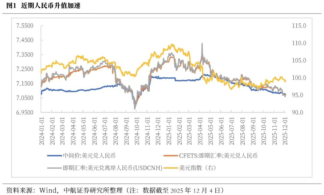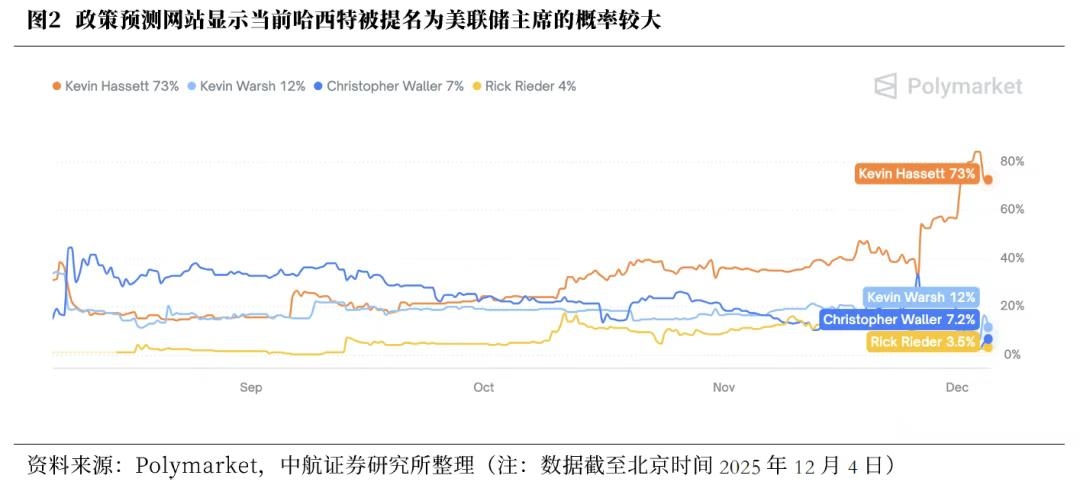 往后看,近期人民币升值过快,不排除短期升值趋势或有所放缓。前期海外流动性和中美关系阶段性缓和带来的预期和结汇需求均已得到一定释放。同时,针对近期人民币汇率升值节奏加快的情况,政策端已通过调升人民币中间价缓释汇率过快升值压力,向市场传递明确引导信号。12月4日,人民币对美元中间价为7.0733,较前一交易日上调21基点。中期来看,人民币升值大趋势不变。今年以来我们多次强调人民币资产有望持续走强,背后核心逻辑源于多重因素的共振。美国开启逆全球化,美元或已进入持续贬值大周期。美联储处于降息周期,中美利差或将持续收窄,人民币资产的相对吸引力有望持续提升,有望承接美联储降息后的美国外流资金。同时,“反内卷” 导向下的经济结构优化与政策调节,正推动低通胀问题逐步改善,为人民币汇率中期走强筑牢内部基本面根基。 海外方面,美联储主席将于明年换届,凯文·哈西特当选概率或较大,若其当选则未来美联储降息周期或将更为明确。当地时间12月2日,美国总统特朗普表示,他很可能在2026年初公布美联储新任主席的人选。而在主席人选方面,目前综合来看,白宫国家经济委员会主任凯文·哈西特(Kevin Hassett)当选概率或较大。此前彭博社援引知情人士消息称,在特朗普及其顾问和盟友眼中,哈西特是下任美联储主席的头号候选人;而当地时间12月2日同日晚间,特朗普在白宫活动上也暗示,哈西特可能会是潜在的美联储主席人选。当前市场对哈西特被提名为联储主席的预期较高,截至北京时间12月4日,政策预测网站Poly market的数据显示,在谁将被特朗普提名为美联储主席问题中,哈西特当选概率为73%,远领先于第二位的凯文·沃什(12%)。从哈西特政策主张上来看,其货币政策立场偏鸽,与特朗普关系紧密,曾表态支持特朗普的关税的政策和呼吁降息的观点。