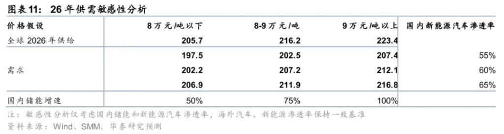 锂价:26年基本面定价8-9万元/吨,看涨27年锂价上行空间 26年供需基本面定价下的价格约8-9万元/吨。基于前述分析,我们结合不同价格下的预计全球碳酸锂供给量及不同国内新能源车与储能增速假设下的总碳酸锂需求,测算了各需求情景下对应的基本面支撑价格。在最乐观的假设下,2026年总需求预计为216.8万吨LCE,碳酸锂基本面支撑价格或在9万元/吨左右,在国内新能源汽车渗透率/储能增速分别为60%/75%的偏中性假设下,2026年总需求预计为207.2万吨LCE,对应碳酸锂价格中枢约为8-9万元/吨水平,该价格水平下全球碳酸锂供给预计为216.2万吨LCE。