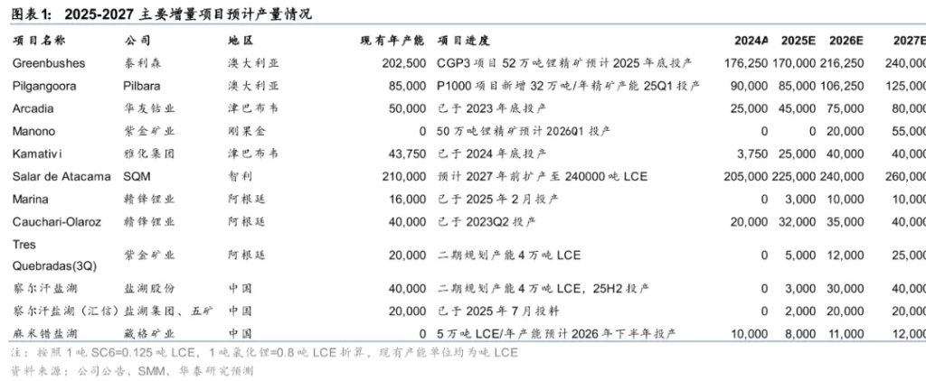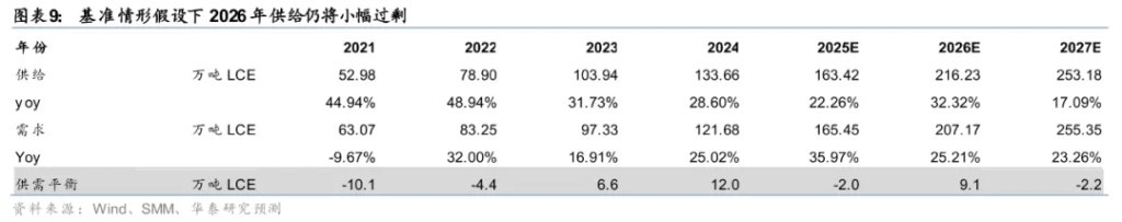 | 供给:预计锂资源26年-27年产量增速为32.3%/17.1% 矿端扰动下,25年全球实际锂资源供给增速或较24年下降至22.3%。因国内江西枧下窝矿山停产影响,根据我们测算,25年全球锂资源实际供给增速从24年的28.6%下降至22.3%,绝对量约为163.4万吨LCE。 受当前价格上涨影响,供给端增量或在26年加速释放,27年供给释放速度或明显放缓。国内方面,根据公司公告,盐湖股份4万吨/年和青海汇信2万吨/年的察尔汗盐湖项目已分别于2025年9月底和2025年6月投料生产,我们预计2026年将放量;非洲方面,华友钴业硫酸锂项目已于2025年下半年投产,雅化集团Kamativi矿以及赣锋锂业Goulamina矿我们预计在2026年将完成达产。另根据公司公告,紫金矿业Manono矿50万吨/年锂精矿项目计划于2026年第一季度投产,折合硫酸锂9.5万吨;澳矿方面,格林布什CGP3项目52万吨锂精矿产能预计2025年底投产,对应约6.5万吨LCE;Pilbara的P1000扩建项目已于2025年第一季度试运行,有望在2026年逐步释放。上述项目投产释放主要集中在26年,而27年新增项目预期明显减少,供给增速或显著下滑。 以8-9万元/吨的碳酸锂价格水平测算,我们预计2025年至2027年全球锂资源供给量分别为163.4万吨、216.2万吨和253.2万吨LCE,同比增速分别为22.3%、32.3%和17.1%。