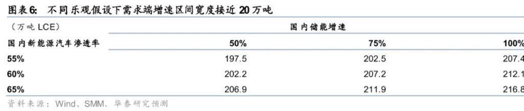 25年需求增速或达到36.0%,2026年碳酸锂需求预计为207.2万吨,同比增长25.2%。由于25年下半年以来国内储能实际出货量持续偏强,导致现实端碳酸锂需求维持高增速,呈现明显淡季不淡现象,据我们测算25年全球锂资源需求增速或达到36.0%。与此同时国内下半年的储能招标数持续超市场预期,导致当前大部分投资者对于储能明年的需求持相对乐观态度。但在乐观中依旧存在着较大的增速预期分歧,不同的增速预期对于碳酸锂的供需影响较大。此外动力电池需求市场预期相对谨慎,但考虑到单车带电量提升以及商用车需求的快速增长,其增速依然有望保持可观水平。基于上述判断,在基准假设中,我们设定2026年国内新能源汽车渗透率为60%,储能国内装机需求量同比增长75%,据此测算2026年全球碳酸锂总需求约为207.2万吨,同比+25.2%。 乐观、悲观假设下的需求端存在较大的增速分歧。我们分别假设国内储能增速为50%、75%、100%,以及国内新能源汽车渗透率为55%、60%、65%,据此构建九种乐观情景组合。我们测算得出对应总需求区间为197.5万吨至216.8万吨,区间宽度接近20万吨。