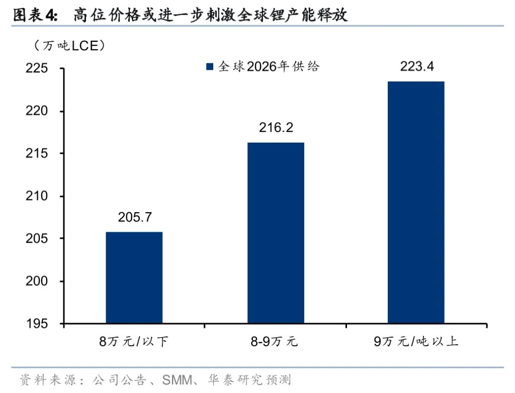 考虑不同价格导致锂全球供给量不同,我们测算:8万元/吨以下/8-9万元/吨/9万元/吨以上的三种价格假设下,26年的锂资源供给量分别为:205.7/216.2/223.4万吨LCE。
