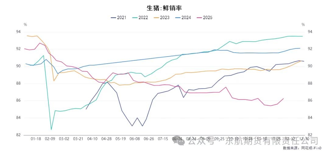 二、需求端:腌腊启动但受制于气温,整体消费提振力度待考 当前生猪需求端处于季节性窗口开启,但实际强度成谜的阶段。传统腌腊消费是支撑四季度至春节前猪肉需求的最重要季节性因素。目前,西南等部分地区已进入腌腊周期,居民制作腌腊肉的需求增多,带动屠宰企业开工率和鲜销率有所回升。这部分需求是当前猪价在巨大供应压力下仍未出现崩盘式下跌的关键支撑。 然而,需求端的潜在风险与不确定性同样突出。其一,气温条件是制约腌腊需求全面启动的硬约束。有效的、大规模的腌腊活动需要持续的低温环境,短暂寒流难以满足要求。当前南方大部分地区气温尚未稳定,这意味着需求的集中释放可能被延后,其峰值强度也可能受到影响。其二,终端消费的整体承受力。尽管腌腊是季节性刚需,但在宏观经济背景下,居民的实际消费力度能否达到往年水平仍需观察。其三,替代品与库存因素。冻品库存的动向以及其它肉类价格也会对鲜猪肉消费是否造成影响。综合来看,需求端虽处季节性上升通道,但其对庞大供应压力的对冲能力仍有待天气和时间的验证,目前难以构成驱动价格趋势性上涨的核心动力。