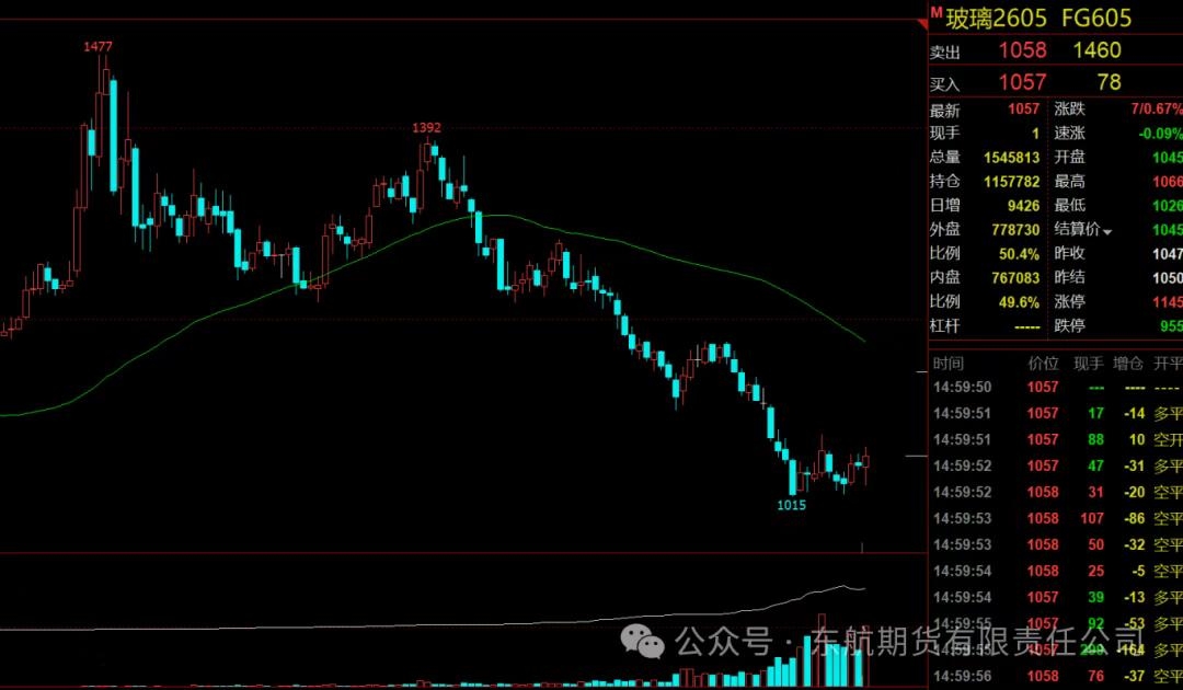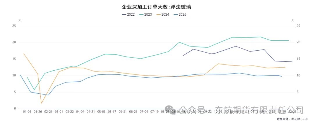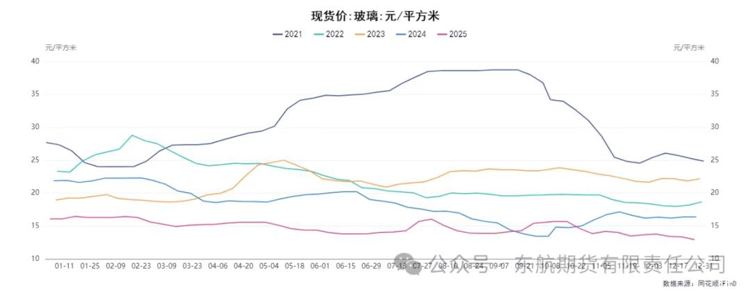 二、需求端:地产疲弱定调淡季基调,刚需采购难以形成驱动 当前玻璃需求端处于趋势性走弱与季节性淡季双重压制的困境之中,缺乏亮点。趋势性压力来源于下游房地产行业的持续低迷。玻璃需求与房地产景气度下降息息相关,而当前地产竣工面积持续下行,直接拖累了玻璃的长期需求前景。反映在微观层面,玻璃下游深加工企业的订单天数长时间处于10天左右的历史低位,企业生产积极性受挫。 季节性因素则加剧了需求的萎缩。时值年末,北方地区气温大幅下降,严重影响户外建筑施工活动,导致区域玻璃需求进一步转弱。虽然市场对春节前可能存在一定的“冬储”预期,但在高库存和弱价格的背景下,下游普遍持谨慎态度,“买涨不买跌”的心理占据主导,主动备货的意愿极其有限。从市场实际成交看,本周主产区产销再度转弱,尽管华东、华南等主销区出货相对良好,但难以改变整体需求疲软的局面。中下游普遍采取“按需采购、消化库存”的策略,市场交投氛围清淡。沙河、湖北等主要产区现货价格承压走弱,现货玻璃成交均价已触及12.93元/平方米,现货的弱势也反过来压制了期货市场的情绪。因此,需求端目前仅能提供最基础的刚性支撑,无法为价格上行提供正向驱动,仅能定义价格反弹的“天花板”。