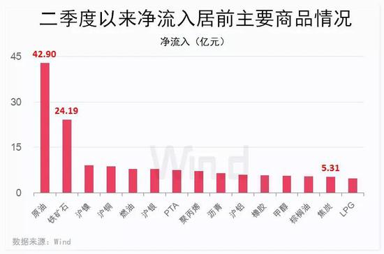资金方面,Wind梳理显示,二季度以来,按最低保证金比例计算,国内商品净流入规模已达172.91亿元。其中,原油品种净流入规模42.90亿元,高于榜首,铁矿石则以24.19亿元的净流入规模紧随其后。