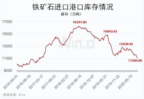其中,铁矿石主力合约5月18日盘中最高冲至705元/吨,也是2019年8月7日以来首次突破700元关口。 针对当下强势的铁矿石行情,机构判断主要受需求刺激影响。 华泰期货研报分析,整体上看短期国内较强的内需刺激政策以及地产基建端开工的迅速恢复,再加上疫情已经得到了有效控制,使得建材的表观消费达到并超过去年同期水平,目前为钢材的产消旺季,预计近期将持续表现较高水平。 报告认为,在成材无恐慌式下跌的压力下,铁矿下行的阻力较多,反而有一定持续反弹的空间。 方正中期期货研报分析,本轮铁矿盘面的大幅拉涨是受高需求,低库存,高基差,以及资金层面的共同驱动。 库存方面,Wind数据统计显示,最新一期进口铁矿石港口库存报11094.90万吨,连续4期下行,并创2016年12月初以来新低。