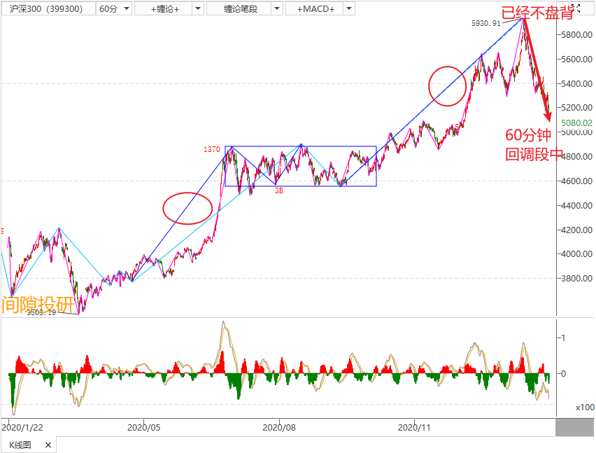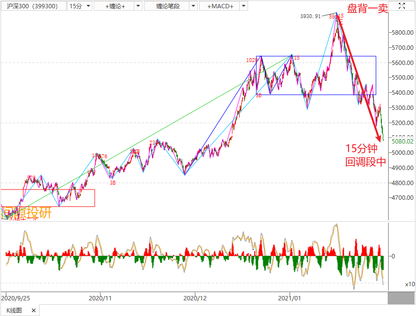 | 3-8 琛实缠论大盘复盘 板块上 长期看好消费,金融,医疗器械,医药,医美,科技,5G,军工,光伏,新能源,农业育种板块。 今天女神节,但是股市的表现却不像“真男人”,一个字“软”,两个字“太软”。指数全线下跌,创业板跌幅甚至接近5% ,抱团取暖变成了抱团杀跌,核电板块逆势上涨,万绿丛中一点红。 谈一谈我的逻辑 第一,短期内指数大跌和国内收紧流动性,利率上行,以及美债收益率短期大涨导致国外股市大跌影响有关。 今年全年的交易我们需要做最坏的打算,争取最好的结果。 第二,今天整个市场的氛围都比较悲观,我一直强调交易是反人性的工作,在他人恐惧的时候我贪婪,但是今天强调一点,贪婪不是盲目贪婪,我们需要在回调走势确认结束的时候果断入场,而不是盲目入场。 第三,今天的下跌,导致沪深300指数安全的做多机会最早在3月下旬才能确认,但我关注的部分板块和个股买点会早于这个时间点,现在是大家做好准备的时候,我今天加了一点仓,仓位不到4层。 第四,从指数看,中证500的估值相比沪深300要低一些,中证500里的中市值票更容易率先上涨。但也不能一概而论,个股需要逐一看,比如五粮液今天这么一跌,PE回到50倍以下了,但还要再等回调结束确认再上车。 先看沪深300缠论走势结论 间隙投研雷达上显示: 今天确认了60分钟上涨段结束,目前处于60分钟回调段。 3月4日确认了30分钟卖点,目前处于30分钟回调段。 2月22日确认了15分钟卖点,目前处于15分钟回调段。 对应股指期货(IF)接下来的操作思路: 第一,今天确认了长线(60分钟)上涨段结束,回顾一下,从2月22日开始,依次确认了15分钟,30分钟和60分钟进入回调段。在2月22日时,我们是无法猜测沪深300会回调这么深,但这不重要,猜测不能支撑操作,重要的是当下如何应对,这也是大家看我文章所需。 第二,因为今天确认了长线(60分钟)上涨段结束,所以当中线(15分钟)回调段结束时,也不能接回多单了,这点是和上周四文章内容的区别,也是基于当下走势变化的应对。 第三,沪深300当下等待的做多机会是长线(60分钟)回调段结束的时候,确认时间最早在3月下旬,我们需要耐心等待走势完成。 具体看沪深300指数缠论走势分解 1,今天确认了长线线(60分钟)上涨段结束,当下处于回调段。