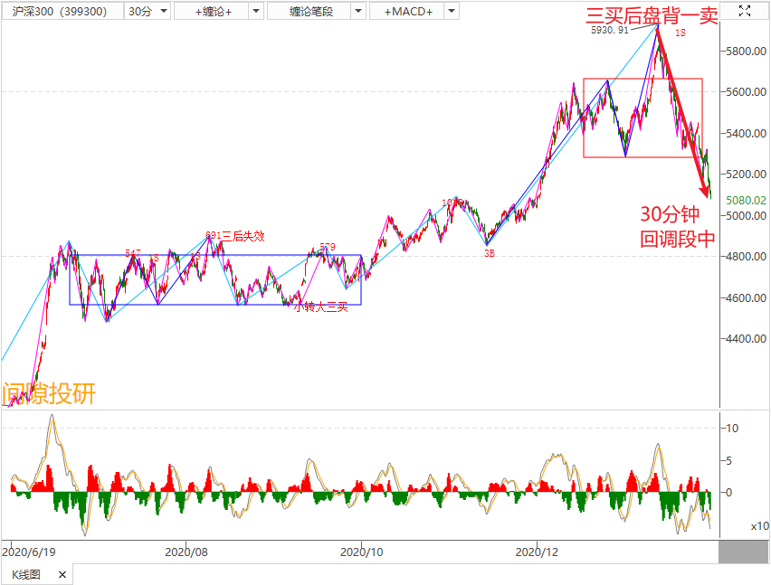 2,3月4日确认了中线(30分钟)三买后盘背一卖的卖点,当下处于回调段中。