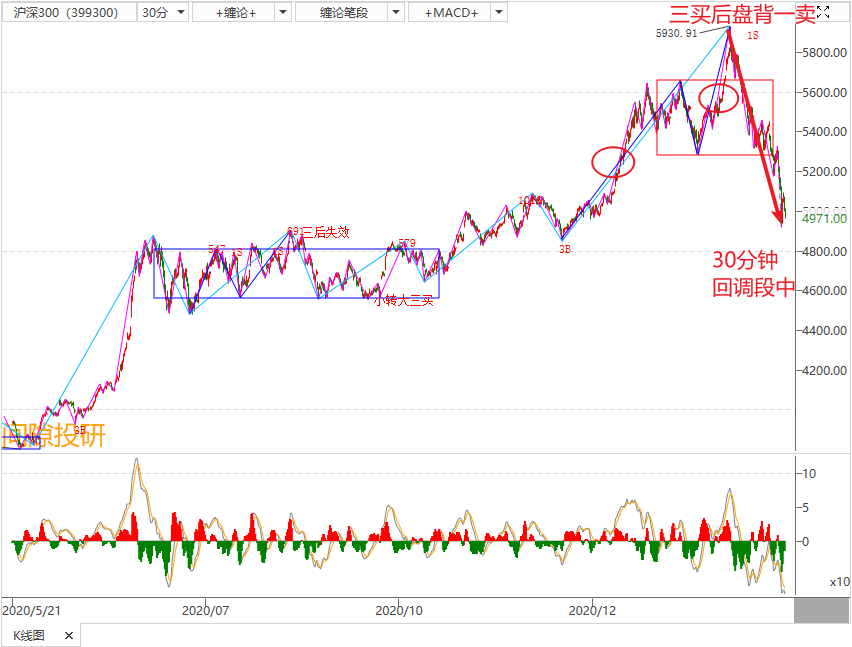 2,3月4日确认了中线(30分钟)三买后盘背一卖的卖点,当下处于回调段中。