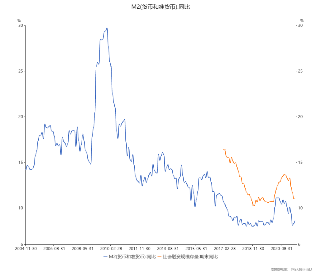 这里的原因很重要,PPI的上涨,并不是因为下游需求的明显提升导致,而是由于国内外疫情的缘故,特别是海外疫情,全球原材料生产的供给不足,当供给弹性非常小的时候,需求稍有起色,原材料价格就容易大涨。 数据上,M2和社融已经快速回落到疫情前的增速水平,反映企业的融资需求下降。