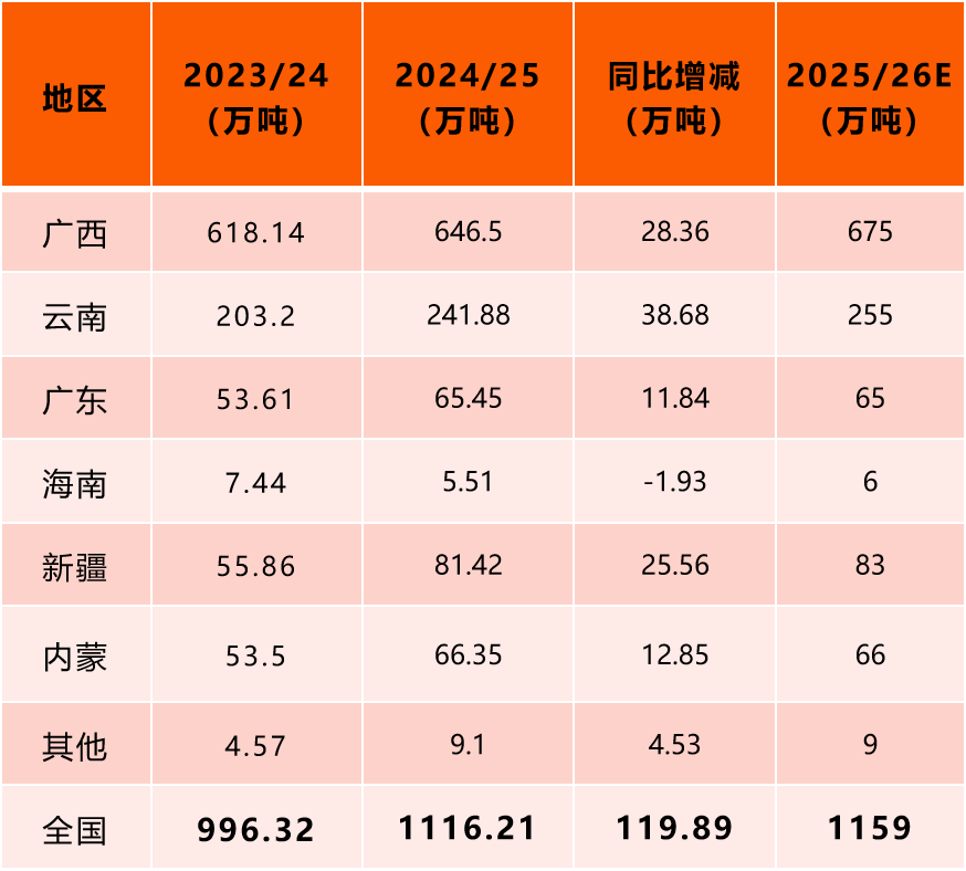 报告品种:白糖 原文链接:https://mp.weixin.qq.com/s/vj75hJU1Ta9LWJnh9ZCTLw 2024/25榨季我国食糖产量为1116.21万吨,较2023/24榨季增加约120万吨。9月17日,呼伦贝尔安琪晟通糖业正式下菜开机生产,标志着我国2025/26年制糖期食糖生产正式开启,有望实现第4年连续性增产。 表:我国近3个榨季的食糖产量及预估情况(单位:万吨) 广西:预计2025/26榨季种蔗面积将达近10年(2015/16榨季)以来峰值水平。据泛糖产业研究调研数据,截至8月末的甘蔗株高已经大部分追平去年,亩有效茎数同比偏少,粗略估算新榨季产糖量为670~680万吨,较上榨季增长约30万吨。 云南:预计种植面积(含境外)较上年增长超7%,目前甘蔗株高同比偏高3-4cm,综合糖厂信息评估,预计新榨季产量将达250~260万吨,同比增加近15万吨。 甜菜糖方面:内蒙古甜菜面积增幅近10%;新疆甜菜面积同样增幅明显,考虑到2个主产区的天气情况不同,初步预计新榨季内蒙古和新疆的甜菜糖产量分别为65~70万吨、83万吨,均同比持平略增。 综合其它产区情况,初步预计2025/26榨季全国食糖产量为1160万吨左右,较上榨季增产约43~50万吨。 七禾带你去调研,最新调研活动请扫码咨询 更多调研报告、调研活动请扫码了解 |