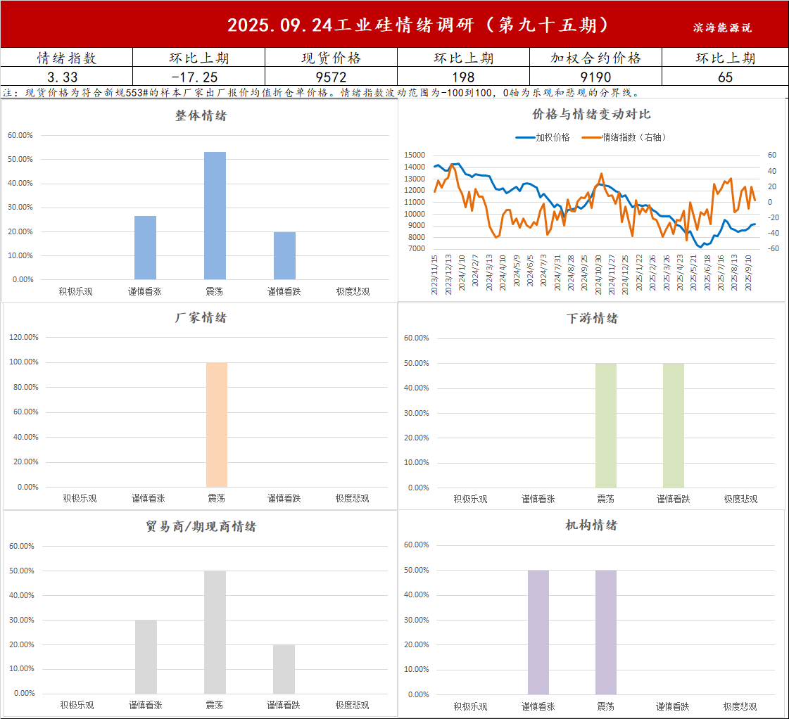 报告品种:工业硅 原文链接:https://mp.weixin.qq.com/s/2_Z9BHqn3keF3JHcobszAw 根据样本统计,本期情绪指数为3.33,较上期回落17.25,仍在0轴以上,样本参与者多数持震荡观点,目前市场新驱动不强。 七禾带你去调研,最新调研活动请扫码咨询 更多调研报告、调研活动请扫码了解 |