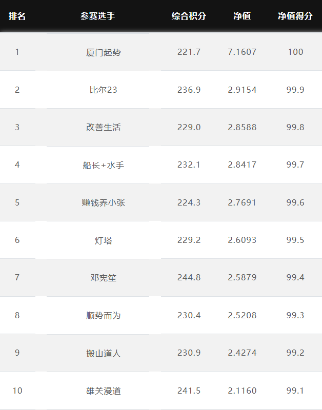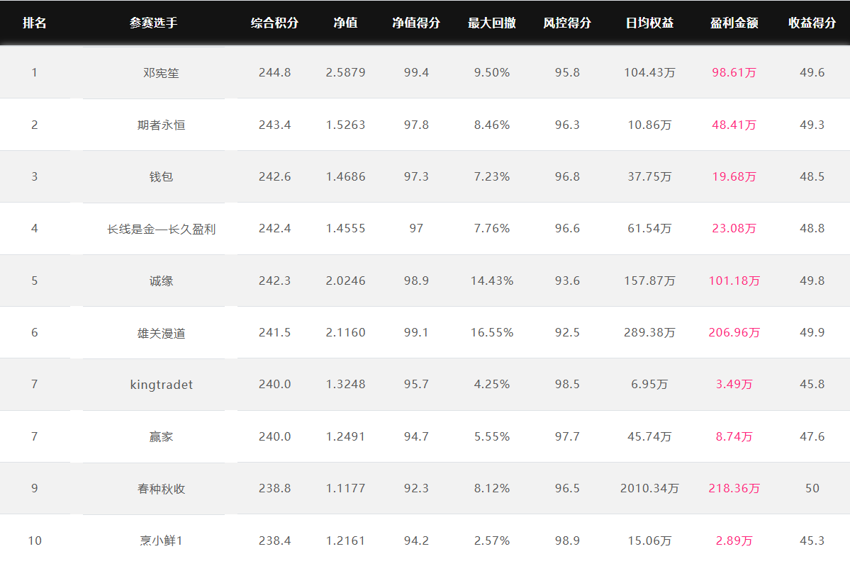 参赛账户“诚缘”,第五届大赛参赛后净值平稳上升,近期调整后净值创新高。该账户交易的品种有沪深300和中证1000及其期权,其中沪深300的盈利贡献最大,中证1000盈利次之。 只做IF和IM及其期权,3个月账户净值2.02! 该账户交易风格相对比较稳健,日均风险度在55.38%。 奖金上不封顶 特定期货公司参赛奖金翻倍 优秀选投 每周选优秀选手对接资金 达标必投 单笔最多给1个亿管理型资金 管理型资金盈利分成20%~70% 免费培训/研报/调研/咨询 诚邀您参赛! 为了促进国内期货市场交易人才的发展和成熟,七禾网举办本次“期货CTA英雄联盟”实盘大赛&超级服务,招募优秀的操盘手,为优秀的交易人才搭建桥梁! 第四届大赛圆满结束,第五届荣耀开启,欢迎参赛!第五届大赛已于2025年7月1日开赛,火热报名中,比赛过程中持续接受报名,大赛奖金&管理型资金&超级服务,等你来领! 2023年2月16日后,在主办方指定的几家期货公司中的某一家C公司新开户参赛,享奖金翻倍! 在主办方指定的几家期货公司中的某一家B公司新开户参赛,享奖金翻倍! 大赛中的优秀选手,只要在大赛中有3个月及以上的实盘业绩,主办方将每周发送优秀参赛者的业绩、资料给合作的数十家资方,供其考察是否投管理型资金。至2022年8月12日,资方已选出23名优秀投顾,累计投入超5.5亿元管理型资金。 优秀选投:通过主办方及资方考核后,将获得管理型资金(资金来源:七禾网自有资金(买优秀选手的基金产品)、七禾网股东、数十家合作资方) 在主办方指定的几家期货公司中的某一家B公司新开户参赛,以及2023年2月16日后,在主办方指定的几家期货公司中的某一家C公司新开户参赛,可以按照:“达标必投”进行考核(将给予单笔100万元~1亿元的管理型资金,分红比例20%~70%),详细规则请联系微信:15858201632 大赛综合排名前10名 2025.9.30 大赛净值排名前10名 2025.9.30 热烈祝贺以下获得管理型资金的交易员 请添加微信:15858201632,或扫描下方二维码,联系客服报名参赛。 相关链接:7月1日正式开赛!奖金不封顶、分成20%~70%、资方已投5亿!【英雄联盟】期货实盘大赛邀您参赛! 恭贺YXR获得100万管理型资金!每周对接资金,分成20%~50%! 恭贺HAYX获得200万管理型资金!每周对接资金,分成20%~50%! 恭贺LHYX获得300万管理型资金!每周对接资金,分成20%~50%! 恭贺北京Y总获得400万管理型资金!每周对接资金,分成20%~50%! 恭贺杭州C总获得1000万管理型资金!每周对接资金,分成20%~50%! 恭贺杭州FY资产获得1000万管理型资金!每周对接资金,分成20%~50%! 恭贺杭州F总获得1000万管理型资金!每周对接资金,分成20%~50%! 恭贺杭州L总获得1000万管理型资金!每周对接资金,分成20%~50%! 恭贺杭州ZM资产获得1000万管理型资金!每周对接资金,分成20%~50%! 恭贺上海YS资产获得1000万管理型资金!每周对接资金,分成20%~50%! 恭贺深圳AMH资产获得1000万管理型资金!每周对接资金,分成20%~50%! 恭贺上海RG资产获得2000万管理型资金!每周对接资金,分成20%~50%! 恭贺杭州G总获得3000万管理型资金!每周对接资金,分成20%~50%! 恭贺杭州H总获得3000万管理型资金!每周对接资金,分成20%~50%! 恭贺上海JQ资产获得4000万管理型资金!每周对接资金,分成20%~50%! 恭贺杭州L总获得4000万管理型资金!每周对接资金,分成20%~50%! 恭贺杭州H总获得4000万管理型资金!每周对接资金,分成20%~50%! 恭贺杭州SZ资产获得5500万管理型资金!每周对接资金,分成20%~50%! 恭贺杭州N总获得6000万管理型资金!每周对接资金,分成20%~50%! 恭贺杭州X总获得8000万管理型资金!每周对接资金,分成20%~50%! |
