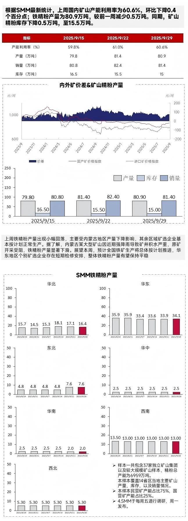 报告品种:铁矿石 原文链接:https://mp.weixin.qq.com/s/vjcfihtToz0NDzgnwVlE0A 根据SMM最新统计,上周国内矿山产能利用率为60.6%,环比下降0.4个百分点;铁精粉产量为80.9万吨,较前一周减少0.5万吨。同期,矿山精粉库存下降0.5万吨,至15.5万吨。 上周铁精粉产量出现小幅回落,主要受内蒙古地区产量下降影响,其余区域矿选企业基本按计划正常生产。据了解,内蒙古某大型矿山因近期强降雨导致矿井积水严重,原矿开采受阻,铁精粉产量显著下滑。展望本周,预计全国铁矿生产将总体按计划推进,华东地区个别矿选企业存在短期检修安排,整体铁精粉产量有望保持平稳。 七禾带你去调研,最新调研活动请扫码咨询 更多调研报告、调研活动请扫码了解 |