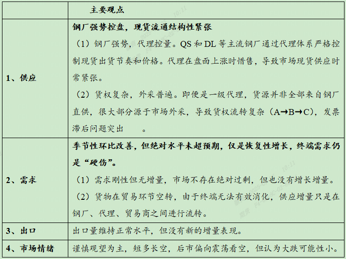 报告品种:不锈钢 原文链接:https://mp.weixin.qq.com/s/GCQm_UDECSZ0NelALo7ftg 摘要 1、调研观点:供应上钢厂强势控盘,现货流通结构性紧张,需求上季节性环比改善,但绝对水平未超预期,仅是恢复性增长,终端需求仍是“硬伤”,隐性库存风险加剧。出口量维持正常水平,但没有新的增量表现。市场普遍对维持短多长空观点,对后市预期偏空,价格高位时超卖锁远期。 2、行情展望:预计短期不锈钢延续区间震荡格局(2511主力合约下沿约12700-12750元/吨,上沿约13100-13200元/吨),价格上有顶,下有底。期货单边,谨慎观望或四季度区间操作思路看待。产业客户若刚需采购,可考虑场外期权,尝试建立短期累购期权,在震荡行情中获取增强收益或以绝对价格低位在旺季获取多头头寸。 3、风险提示:隐性库存的集中释放、终端需求持续疲弱、宏观情绪转弱板块整体回调。 一、调研背景和目的 近期随着不锈钢核心原材料镍铁和铬铁的价格持续上涨,钢厂现货期盘开盘价亦小幅调涨,叠加“金九银十”旺季下的需求复苏预期,不锈钢盘面价格重心有所上移。为了解传统旺季下市场的真实需求和出口复苏情况,我们于9月15日-18日在不锈钢加工和贸易的重要集散地--佛山,走访了3家QS、DL代理商、2家供应链机构和2家工贸商,共计七家企业,涉及不锈钢市场多个环节,发布相应调研报告系列共3篇,现将调研情况简述如下: 二、三天调研总结 三、行情展望 预计短期不锈钢延续区间震荡格局(2511主力合约下沿约12700-12750元/吨,上沿约13100-13200元/吨)。价格上有顶:13100-13200元/吨是较强的压力位。理由:①价格达到这个位置后,下游接受度差;②预期青山等钢厂可能会在此价位附近进入期货市场建立空头头寸以锁定利润或为后续采购低价原料做准备。价格下有底:12700-12750元/吨近期强支撑位。理由:①生产成本(镍铁价格在955元/镍点)对价格有支撑;②钢厂挺价意愿强,不愿轻易下调现货价格。 交易策略:期货单边,谨慎观望或以区间操作思路看待。产业客户若刚需采购,可考虑场外期权,尝试建立短期累购期权,在震荡行情中获取增强收益或以绝对价格低位在旺季获取多头头寸。 风险点:隐性库存的集中释放、终端需求持续疲弱、宏观情绪转弱板块整体回调。 七禾带你去调研,最新调研活动请扫码咨询 更多调研报告、调研活动请扫码了解 |