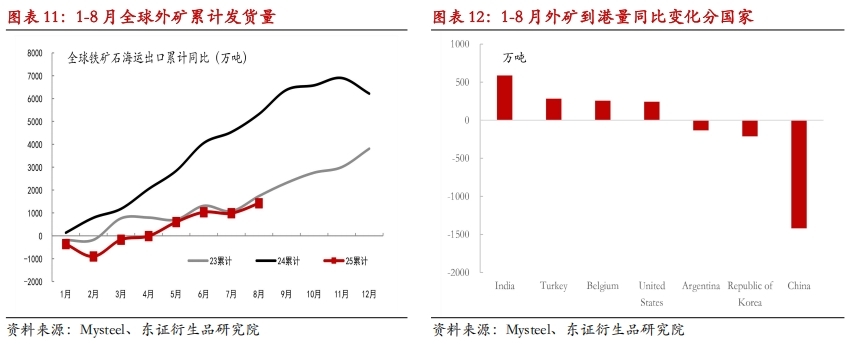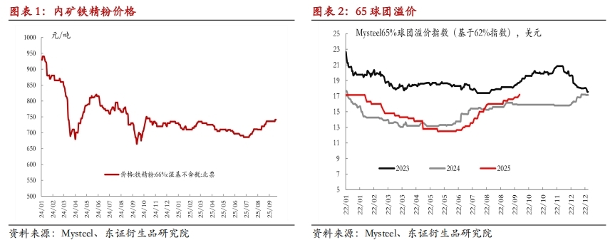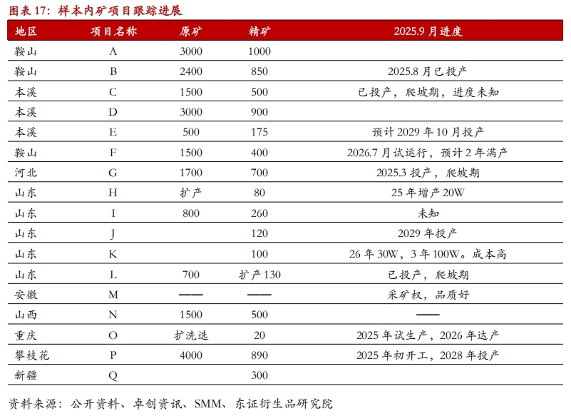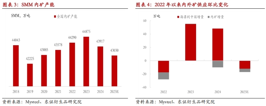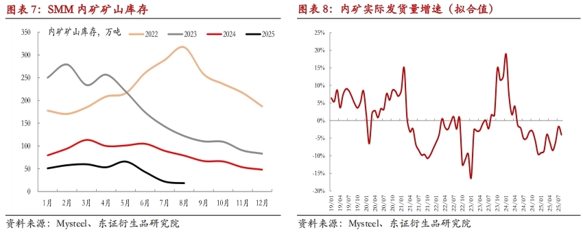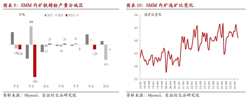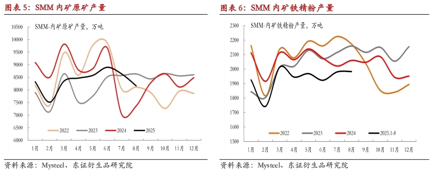 报告品种:铁矿石 原文链接:https://mp.weixin.qq.com/s/8X4qaD4ip_08Pnldx4UsBA 9月中旬,我们跟随卓创资讯对华东地区内矿进行调研,以跟踪当地内矿生产现状、成本和未来增产计划。 调研背景,2025年,内矿产量表现再度低于市场预期。SMM统计的1-8月份全国内矿原矿产量累计下滑2000万吨,精粉产量下滑1000万吨。今年以来内矿问题包括,河北承德减产、山西减产扩大、华东安监停产等等。分地区看,全国各主要内矿产区产量均有所下滑。华北地区内矿产量降幅最大,2025年1-8月累计达800万吨,华东和东北也均有100万吨左右降幅。 内矿产量,年内预计仍然处于青黄不接状态,新矿尚未集中投产,老矿产量降幅大于零星新项目增产量。华东地区内矿产量上半年受安监影响部分长期停产,年中以来产量陆续恢复。 成本方面,尽管原矿品位明显衰减,但受益于开采和洗选技术升级,近年内矿成本波动不大。大部分内矿完全成本处于500-600元区间(80+美金),部分高位成本在700-800元(100+美金)。近年矿价持续高位下,内矿整体盈利较为丰厚。 长期产能方面,内矿增产趋势不变,但资源禀赋、投资规模、环保安监等影响导致新增项目落地缓慢。走访企业表示新增项目多在26年年中试生产,考虑1-2年增产爬坡期,预计全国内矿产量27-28年开始恢复正增长。 内外矿供应同步减量,叠加铁水端持续高位,共同支撑矿价走势年内超预期偏强。年内铁矿供应短暂下降已成事实,长期增产节奏仍待检验。港口库存持续处于中性水平,钢厂自年中以来对矿价悲观情绪大幅缓解,叠加十一假期,矿价9月份以来结构性偏强。但与此同时,终端成材需求略有走弱,成材持续累库下市场对需求端预期谨慎。终端成材旺季表现或并不旺,进而制约矿价上行空间。 风险提示:国内基建政策,产量调节政策。 一、调研背景:内矿产量连续3年下降 9月中旬,我们跟随卓创资讯对华东地区内矿进行调研,以跟踪当地内矿生产现状、成本和未来增产计划。 2025年,内矿产量表现再度低于市场预期。SMM统计的1-8月份全国内矿原矿产量累计下滑2000万吨,精粉产量下滑1000万吨。Mysteel口径全国126家矿山开工率同样累计下滑2%。叠加外矿到港量1-8月份以来累计下降约1500万吨。内外矿供应同步减量,叠加铁水端持续高位,共同支撑矿价走势年内超预期偏强。今年以来内矿区域性问题包括,河北承德减产、山西减产扩大、华东安监停产等等。分地区看,SMM口径下,全国各主要内矿产区产量均有所下滑。其中,华北地区内矿产量降幅最大,2025年1-8月累计达800万吨,华东和东北也均有100万吨左右降幅。 二、结论概要:青黄不接,内矿“基石”增产预期推迟至27-28年 综合来看,内矿铁精粉产量年内预计仍然处于青黄不接状态,新矿尚未集中投产,老矿产量降幅大于零星新项目增产量。华东地区内矿产量上半年受安监影响部分长期停产,年中以来产量陆续恢复。 成本方面,尽管原矿品位明显衰减,但受益于开采和洗选技术升级,近年内矿成本波动不大。大部分内矿完全成本处于500-600元区间(80+美金),部分高位成本在700-800元(100+美金)。近年矿价持续高位下,内矿整体盈利较为丰厚。 长期产能方面,内矿增产趋势不变,但资源禀赋、投资规模、环保安监等影响导致新增项目落地缓慢。走访企业表示新增项目多在26年年中试生产,考虑1-2年增产爬坡期,预计全国内矿产量27-28年开始恢复正增长。 年内铁矿供应短暂下降已成事实,矿价供应端短期支撑仍强,长期增产节奏仍待检验。港口库存持续处于中性水平,钢厂自年中以来对矿价悲观情绪大幅缓解,叠加十一假期,矿价9月份以来结构性偏强。但与此同时,终端成材需求略有走弱,成材持续累库下市场对需求端预期谨慎。终端成材旺季表现或并不旺,进而制约矿价上行空间。 三、详细调研纪要 1、矿山A 基本情况:钢厂旗下矿山,成品为65%左右碱粉,选矿比1.7:1。 产能产量:现有产能200万吨,2025年产量目标130万吨。目前原矿不足,钢厂自用与外卖比例1:1,精粉贵于球团,自有球团产能长期停产。共有矿山3个,但由于资源衰竭目前在产仅1个,外购矿1个。 在建矿山:预计2029年投产,铁精粉产能120万吨左右,原矿品位在50%左右,选比预计1.5:1,成本较现有产能更低。 成本情况:之前精粉完全成本超过900元/吨。2025年通过裁员降本,提升工艺,目前生产成本不含税700多,含税完全成本800左右。 库存情况:目前场内铁精粉基本无库存,今年4-5月库存最高到过3万吨,6月底以后到现在处于无库存状态,国内精粉较乌精、卡粉有价差优势,钢厂近期加大配比。 销售区域:辐射山东、河北、河南省内企业为主。 2、矿山B 基本情况:山东最大的铁矿石生产基地,国企部分控股,民企主导。 产能产量:2023年产能216万吨,2025年产能300万吨。现有产量220,今年实际产量计划240万吨,计划明后年达产至300万吨。达产速度主要受制于原矿。 成本情况:成本500-600,目前利润200。选矿成本直接成本几十元。 库存情况:上半年港口乌精多,最大库存4-5万吨。下半年开始以来零库存,下游拿货积极。内矿目前较外矿有性价比。 3、矿山C 基本情况:央企旗下矿山。 产能产量:设计200万吨,2025年计划50万吨,实际预计70万吨铁精粉。开采面更换,一期项目预计2026年到期,置换二期项目。选矿比4左右。去年11月份山东地区事故,该矿区生产由11月份停产至今年2月。长期无增产计划。 成本情况:完全成