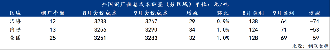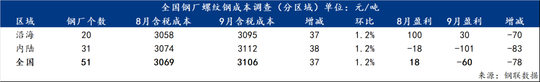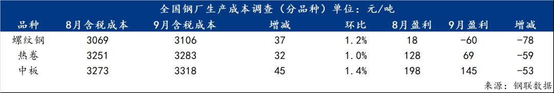 报告品种:螺纹钢 原文链接:https://mp.weixin.qq.com/s/M-GsbqGsBms1QYug_IYLjQ 核心观点: (1)9月底对全国主要样本高炉生产企业进行调查,其产品生产成本小幅增加,幅度在40元/吨左右。数据显示,当前螺纹钢平均含税成本为3106元/吨,环比增加37元/吨,增幅1.2%;热卷平均含税成本为3283元/吨,环比上涨32元/吨,增幅1%;中厚板平均含税成本为3318元/吨,环比上涨45元/吨,增幅1.4%。 (2)9月Mysteel(62%)铁矿石指数平均价在105美元,较上月上涨4美元;9月华北地区二级冶金焦均价为1410元/吨,较上月上涨11元/吨;9月唐山钢坯含税出厂价平均为3029元/吨,较上月下跌51元/吨。 (3)9月底对全国部分样本高炉生产企业盈利情况进行调查,螺纹钢样本平均利润-60元/吨,较上月盈利减少78元/吨,热卷样本平均盈利69元/吨,较上月盈利减少59元/吨,中厚板样本平均盈利145元/吨,盈利较上月盈利减少53元/吨。 长流程钢厂主要品种生产成本及盈利情况 Mysteel调查的全国91家高炉钢厂,9月底螺纹钢平均含税成本为3106元/吨,环比上涨37元/吨,增幅1.2%,盈利-60元/吨,减少78元/吨;热卷为3283元/吨,环比增加32元/吨,增幅1%,盈利69元/吨,减少59元/吨;中厚板为3318元/吨,环比增加45元/吨,增幅1.4%,盈利145元/吨,减少53元/吨。 表一:全国91家样本钢厂生产成本(分区域)调查统计(单位:元/吨) 螺纹钢方面,9月底对全国51家螺纹钢生产企业调研了解到,螺纹钢平均成本为3106元/吨,环比增加37元/吨,增幅1.2%;分区域来看,沿海地区20家钢厂螺纹钢平均成本为3112元/吨,环比增加38元/吨,增1.2%;内陆地区31家钢厂螺纹钢平均成本为3095元/吨,环比增加37元/吨,增幅1.2%;盈利空间方面,9月份螺纹钢生产企业盈利空间在-60元/吨,环比减少78元/吨。 表二:全国51家主要样本高炉钢厂螺纹钢成本(分区域)调查统计(单位:元/吨) 热卷方面,9月底对全国25家热轧板卷生产企业调研了解到,热卷平均成本为3283元/吨,环比增加32元/吨,增幅1%;分区域来看,沿海地区12家钢厂热卷平均成本为3267元/吨,环比增加29元/吨,增幅0.9%;内陆地区13家钢厂热卷平均成本为3290元/吨,环比增加34元/吨,增幅1%;盈利空间方面,9月份热卷生产企业盈利69元/吨,盈利环比减少59元/吨。 表三:全国25家主要样本高炉钢厂热卷成本(分区域)调查统计(单位:元/吨) (备注:样本企业包括91家长流程钢厂;含税成本为含税轧制成本,不包括折旧以及管理、营销、财务等三项费用;利润计算是按照主导市场销售价格减去含税轧制成本。) 七禾带你去调研,最新调研活动请扫码咨询 更多调研报告、调研活动请扫码了解 |