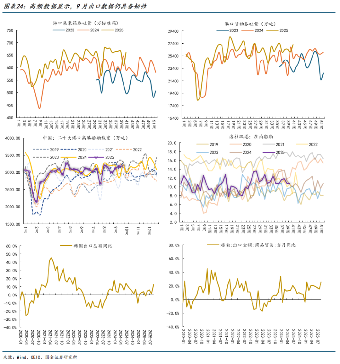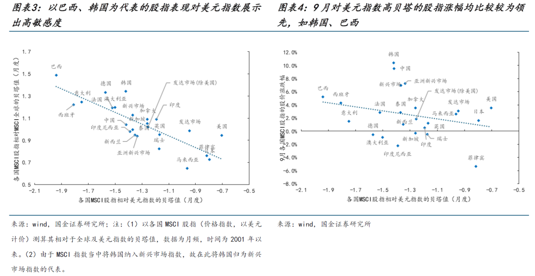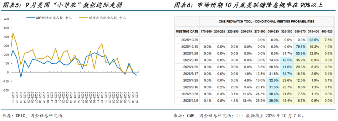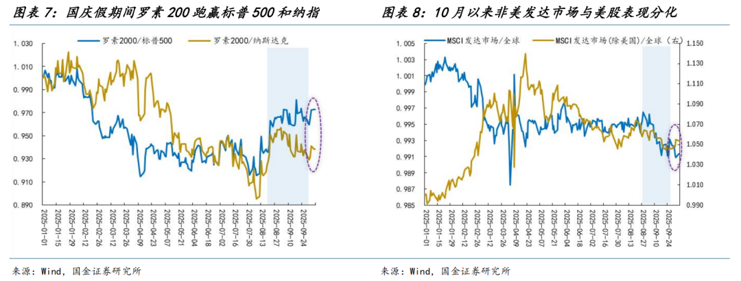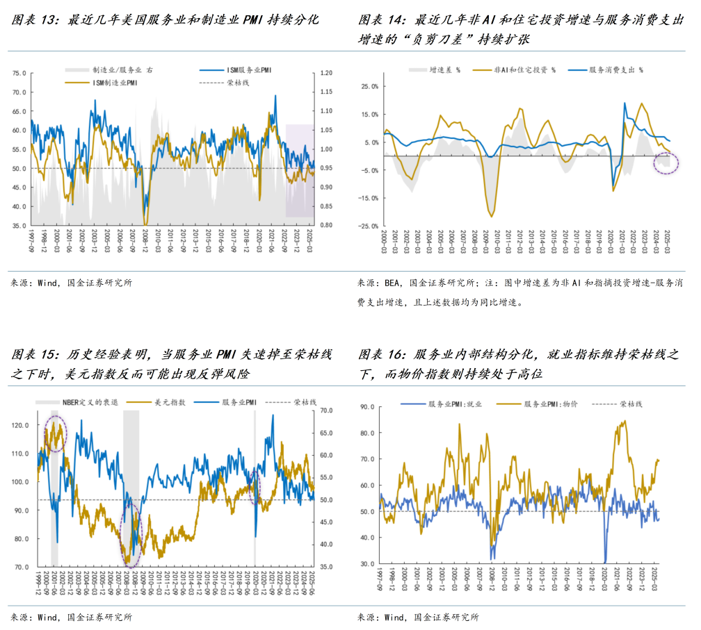 1、当“弱美元”成为一切的期盼 回看9月以来美元指数的交易逻辑,整体经历了“美联储降息预期交易→降息落地+经济软着陆→美国政府关门”,尽管中间出现边际反弹,但整体震荡偏弱。在此期间,全球主要资产呈现一个非常明显的交易特征是:多数资产价格的走势是建立在“弱美元”的叙事逻辑之上: 权益市场来看,受益于美联储货币宽松和“弱美元”的外溢效应,全球股市上涨且体现为“新兴市场>发达市场”,这一交易特征延续至国庆期间(仅在中间美元反弹阶段存在短暂的收敛)。即便9月底以来市场开始交易美国政府关门,但全球股市并未出现下跌,包括美股在内的全球股市整体上涨且新兴市场继续跑赢发达市场。 背后逻辑在于:市场倾向于认为本次美国政府关门导致经济冲击或偏短期;与此同时,关键经济数据的“缺席”导致市场更多依赖私营部门的数据,而“小非农”数据的走软显示当下美国就业市场下行风险的上升,市场对10月底美联储采取连续降息25BP仍持乐观定价,且经济“软着陆”依然是基准情形。 实际上,对全球经济周期和美元指数高度敏感(以股指对美元指数的贝塔值进行衡量)的国家/地区在9月实现更高的股价涨幅,典型的以巴西和韩国为代表的国家因获得AI扩散和有色金属矿业两大逻辑的分别加持而明显跑赢。 此外,中国资产而言,内部结构的分化(超额收益更多集中于电力设备、有色以及电子等,而防御性的银行红利和消费为代表的顺周期资产并未出现明显上涨)意味着对于市场而言,本身并未做多或者做空经济基本面,只是受益于本轮全球流动性宽松的溢出效应。 进入10月“弱美元”的交易开始出现了一些新的线索:①美股市场来看,过去美国科技股的走强与美国强劲的服务业和持续扩张的债务规模强相关,而这个循环主要是通过美元走弱得以实现。然而,最近与美国经济周期关联度更高的罗素2000再次跑赢标普500和纳斯达克(此前在8月下旬全球央行年会后出现过阶段性跑赢),这可能才刚刚开始。 ②发达市场(除美国)开始跑赢美股,这意味着美国作为本次宏观风险事件(政府关门)的核心区域,投资者可能更加青睐于美国以外的市场,叠加日本高市早苗或将成为日本首位女首相带动日本股市上涨,反而使得国庆期间美股并未跑赢美国以外的发达市场。 商品市场来看,以黄金、白银为代表的贵金属成为本轮美元流动性盛宴下的显著受益者,9月以来两者上涨斜率陡峭化且经济“软着陆”预期下白银的上涨弹性优于黄金,并共同跑赢以铜为代表的工业金属。但如同权益市场出现新的交易特征一般,进入10月份我们同样在商品市场看到了一些变化,随着供给收缩+“软着陆”预期下需求韧性,9月底以来铜开始跑赢黄金,且国庆期间铜和白银为代表的工业属性更强的品种价格上涨的弹性均优于黄金。 值得一提的是,尽管市场共识美元走弱的金属属性是有色金属的主要驱动,但当下以铜为代表的工业金属供需偏紧,一旦出现需求修复,反而更可能成为上涨弹性更高的品种。 当美元走弱成为“万众期待”,美元却并未跌破前低。值得我们思考的是,在全球市场都在享受美元流动性盛宴之际(事实上今年以来“弱美元”在多数时刻主导了市场的交易逻辑),当前市场对于做空美元的共识高度一致,美元指数期货的非商业净持仓最近持续处于低位。期间,大部分资产都在这一逻辑下创下近期的新高,需要以“弱美元”为一切买单的假设深入人心,而最近被高度做空的美元却没有跌破前低。 实际上,观察9月以来美元指数的走势,尽管整体震荡偏弱,但并未出现显著的下跌且美元指数也没有向下突破创下新低,仅在9月美联储降息落地之前出现试探性下跌(盘中最低触及96.2),显示当前美元指数的走弱其实也并没有那么顺畅。 2、美元的路径推演:当服务业与制造业出现长期背离后,经济走向“滞胀”甚至衰退or复苏? 2022年开始美国经济经历了2000年以来服务业和制造业分化持续时间最长的阶段,整体呈现“服务业强、制造业弱”的“冰火两重天”的格局,这背后是财政主导的因素带来了美国本轮周期的最大分歧。数据显示,自从2022年11月以来美国制造业PMI向下突破50荣枯线之后,高利率环境使得美国制造业PMI至今尚未向上实现有效突破荣枯线;反观服务业PMI,受益于薪资增长多数时间内均处于荣枯线之上,这也成为美国经济韧性的主要来源。 事实上,拆分美国GDP分项来看,尽管服务消费支出增速有所回落,但实际上仍明显高于剔除AI和住宅后的投资增速,且两者之间的“负剪刀差”(非AI和住宅投资增速-服务消费支出增速)仍在低位。而当下美国服务业和制造业的分化也使得未来两者不同的演绎路径可能导致美国经济可能走向不同的方向,或将成为未来美元指数走弱的逆风因素。对于投资者而言,更为重要的是在美元做空预期一致的情形下关注“弱美元”交易叙事出现转变的可能性。 路径一:如果服务业指示了未来美国经济的方向,那么则是滞涨走向衰退:美元可能率先出现反弹。从历史经验来看,当服务业PMI失速掉落至50荣枯线之下,期间经济可能也存在外生冲击导致经济指标出现快速下滑如2008年全球金融危机和2020年的全球公共卫生事件,美国经济往往陷入NBER所定义的衰退区间,美元指数则因流动性紧缩和避险的底层资产属性更易于出现快速反弹。 从近期披露的9月美国
