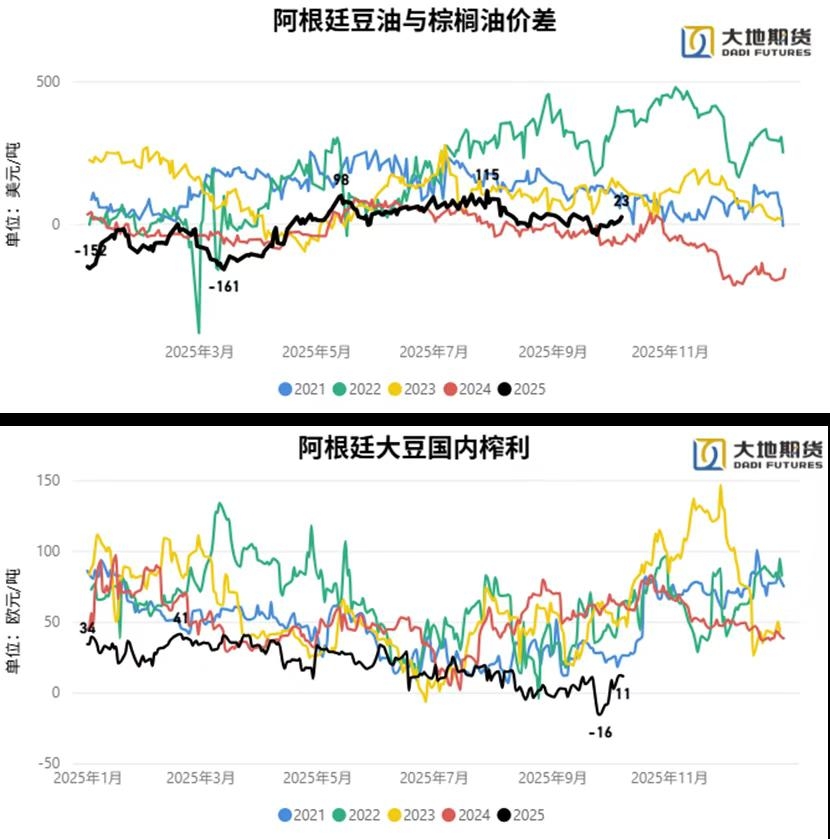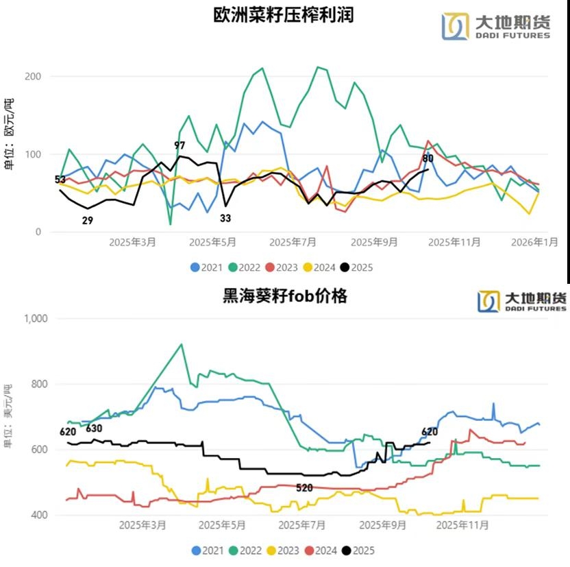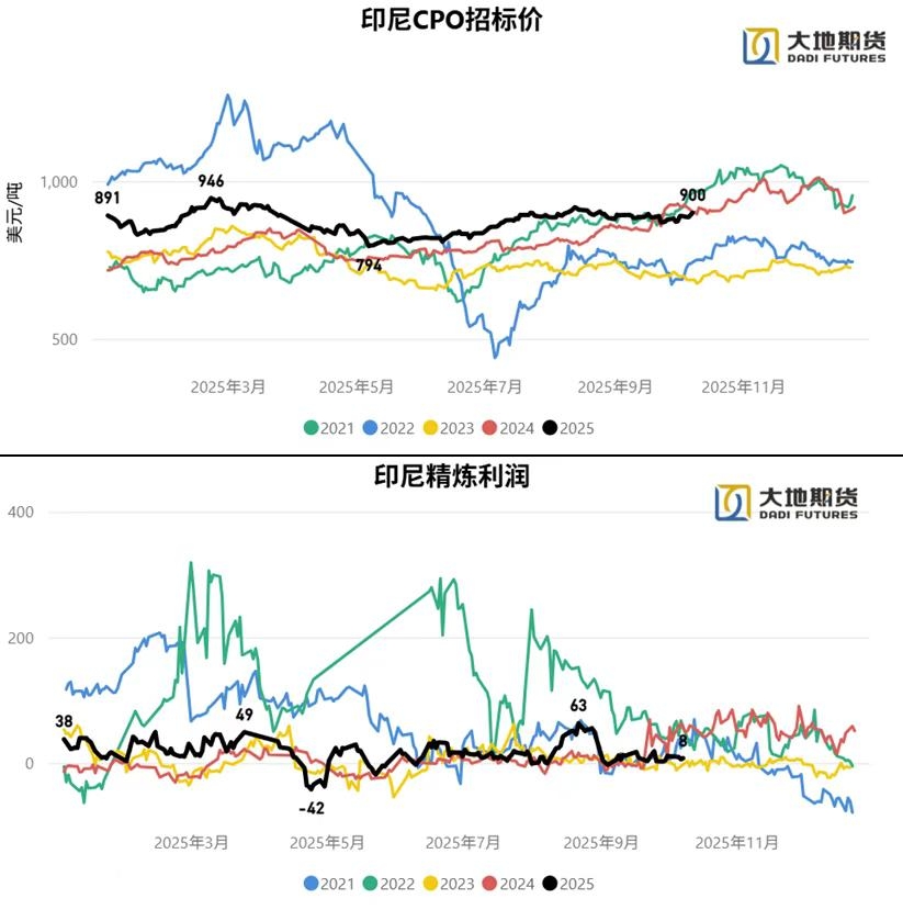 01棕榈油情况 马来:假期价格快速上涨,但与基本面无关 假期马来的数据没有太大的变化,市场对产量的预估在环减2-4%之间摇摆,各机构给出的预估数据对库存的预估大部分都在215万吨左右摇摆,无非是产量和出口多给少给的问题,目前产地的供给没有可交易的矛盾。 据部分企业的产地调研情况反馈,10月马来的产量有5%左右的环比增产预期,那对应的10月还将会有一个累库的时间点,因此进入减产季产地的库存可能没有之前预期的那么低。短期来看,这个位置去做多棕榈油并没有一个很好的基本面支持的话,价格的风险是比较高的。 数据来源:mpob,大地期货研究院 印尼&马来:供给平稳需求弱势,国际供给紧张助力棕榈 产地的期现结构和月差结构还是维持偏弱以及倒挂的状态,中国假期的集中买船也并不代表国内现货的好转,更多的是对假期外盘上涨的投机行为。从各种价差指标看,印尼产量相较于马来也是更好的,之前过多的降水也没有对产量造成过多的问题。 国际角度看,由于南美豆油压力出尽,以及美豆对中国贸易问题的持续拉锯,叠加葵油带动的国际菜油价格上涨,全球确实在短期找不到比棕榈油更加便宜的油脂,且除了棕榈油其他油脂或因收割时间或因人为原因都处于阶段性偏紧的状态,这对棕榈油的利好会比棕榈油自身的基本面利好要强的多。 数据来源:路透,大地期货研究院 印尼:B50利空近月,利多远月 节后印尼传出了B50的推进计划,以及在今年印尼能源部提到预计将在26年下半年推行B50。先不管产能之类的问题,毕竟想要实现真正的B50就目前印尼的各项条件看是完成不了的,假设印尼仅和今年类似,在掺混略增的基础上名义上完成B50,那么对于本来26年的一个全年的需求利多,在目前的预期下就会变成只能提供半年需求增量的利多,利多的时间窗口被压缩。 且由于B50预期的延后,对应01合约棕榈油的需求利好多减少了一个,美生柴延期,印尼B50延后,01的需求边际增量预期在萎缩。反而诸多生柴需求的延期,在不断强化远月05合约棕榈油的利多基础,考虑到国内外偏弱的现货,未来棕榈油1-5反套可能将是比较有价值的交易策略。 数据来源:路透,大地期货研究院 02菜系 加拿大:菜籽卖压持续 加菜籽价格假期跟随美豆价格反弹,加菜籽产区和港口基差依旧较差,加菜籽价格没有本质上的改善。在中国无法采购新作菜籽的情况下,加菜籽依旧面临着极大的卖压,且目前也只有欧盟有提供相应的进口需求。 加拿大打开欧洲的需求需要维持极低的加菜籽与澳菜籽的价差,同时欧洲在今年产季给出比较好的菜籽榨利,24年度就是由于欧洲的菜籽榨利一直维持低位,所以一直没能打开进口需求。 目前看,欧洲的菜籽榨利大幅提升,加澳菜籽价差维持低位。按此趋势发展,加菜籽可以在欧洲市场找到一定的需求空间,但后期能否持续得看欧洲地区的葵系价格能否一直维持高位。 数据来源:路透,彭博,大地期货研究院 欧盟:菜葵价格上涨,榨利大幅好转 欧盟葵油价格持续走强,带动菜油价格大幅上涨;葵油价格目前强势的主要原因,一是今年葵籽在预期丰产的基础上减产,二是目前正值葵籽收获开始,是葵系供应最紧张的时期,俄罗斯和乌克兰的压榨原料短缺。不过随着10月份葵籽的集中上市,葵系价格可能会面临回调,俄罗斯葵籽价格也有所回落。 但今年俄罗斯的丰产预期也在下调,欧盟和乌克兰已经是减产的状态,预计新作葵系价格依旧维持较高水平。预计在榨利走好的驱动下,欧盟地区会在新一年度增加对外部的油籽进口需求。 数据来源:路透,彭博,大地期货研究院 美洲:南美豆系压力释放完毕 美国政府原定于10月7日宣布的对农民经济援助计划因政府停摆被推迟,预计拨款约120—130亿美元。由于中美贸易问题持续,以及美国国内大豆榨利较好,农民惜售待援,对美豆阶段性价格有所支撑。 阿根廷在结束“0”关税出口后,豆油价格快速回升,国际豆棕价差以及美国与阿根廷的豆油价差也随之回升,国际棕榈油又成为相对最便宜的油脂。且阿根廷国内的大豆榨利依旧维持历史低位,南美很难再提供廉价的豆油去竞争棕榈油的市场份额。 数据来源:路透,彭博,大地期货研究院 03需求情况 印度:需求阶段性兑现,油脂价格上方空间受限 从新加坡和印度的反馈来看,由于前面集中采购导致的累库,9月印度的港口库存和渠道库存可能会升至100万吨和150—180万吨水平,都是历史同期偏高的位置。且10月产地出口虽然较好,但基本没有对印度的发船,第三世界国家需求较好。可见目前印度的短期需求已经阶段性兑现了,对于10月中下旬的排灯节而言,已经备货完毕;印度的下一轮需求要等到四季度末期的制约备货。 近期印度国内的菜油价格快速回落,开始压缩印度国内其他油脂的上方空间。综合看,棕榈油的需求端短期陷入沉寂,虽然单边走势依然强劲但可持续性耐人寻味。 数据来源:路透,彭博,大地期货研究院 责任编辑:七禾编辑 |