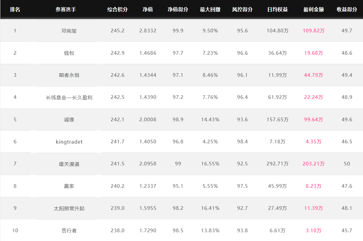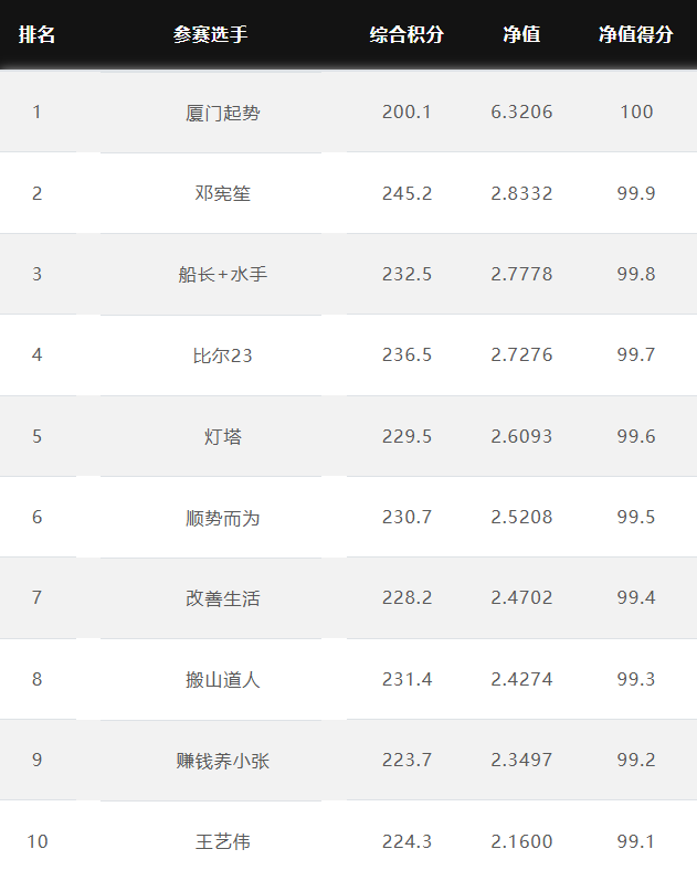 参赛账户“长线是金—长久盈利”,第五届大赛参赛后早期净值平稳上升,9月1号后震荡调整中略有上升,账户1手IF,盈利20余万。 单品种交易,账户净值1.43! 该账户交易风格比较稳健,日均风险度在31.99%。 奖金上不封顶 特定期货公司参赛奖金翻倍 优秀选投 每周选优秀选手对接资金 达标必投 单笔最多给1个亿管理型资金 管理型资金盈利分成20%~70% 免费培训/研报/调研/咨询 诚邀您参赛! 为了促进国内期货市场交易人才的发展和成熟,七禾网举办本次“期货CTA英雄联盟”实盘大赛&超级服务,招募优秀的操盘手,为优秀的交易人才搭建桥梁! 第四届大赛圆满结束,第五届荣耀开启,欢迎参赛!第五届大赛已于2025年7月1日开赛,火热报名中,比赛过程中持续接受报名,大赛奖金&管理型资金&超级服务,等你来领! 2023年2月16日后,在主办方指定的几家期货公司中的某一家C公司新开户参赛,享奖金翻倍! 在主办方指定的几家期货公司中的某一家B公司新开户参赛,享奖金翻倍! 大赛中的优秀选手,只要在大赛中有3个月及以上的实盘业绩,主办方将每周发送优秀参赛者的业绩、资料给合作的数十家资方,供其考察是否投管理型资金。至2022年8月12日,资方已选出23名优秀投顾,累计投入超5.5亿元管理型资金。 优秀选投:通过主办方及资方考核后,将获得管理型资金(资金来源:七禾网自有资金(买优秀选手的基金产品)、七禾网股东、数十家合作资方) 在主办方指定的几家期货公司中的某一家B公司新开户参赛,以及2023年2月16日后,在主办方指定的几家期货公司中的某一家C公司新开户参赛,可以按照:“达标必投”进行考核(将给予单笔100万元~1亿元的管理型资金,分红比例20%~70%),详细规则请联系微信:15858201632 大赛综合排名前10名 2025.10.10 大赛净值排名前10名 2025.10.10 热烈祝贺以下获得管理型资金的交易员 请添加微信:15858201632,或扫描下方二维码,联系客服报名参赛。 相关链接:7月1日正式开赛!奖金不封顶、分成20%~70%、资方已投5亿!【英雄联盟】期货实盘大赛邀您参赛! 恭贺YXR获得100万管理型资金!每周对接资金,分成20%~50%! 恭贺HAYX获得200万管理型资金!每周对接资金,分成20%~50%! 恭贺LHYX获得300万管理型资金!每周对接资金,分成20%~50%! 恭贺北京Y总获得400万管理型资金!每周对接资金,分成20%~50%! 恭贺杭州C总获得1000万管理型资金!每周对接资金,分成20%~50%! 恭贺杭州FY资产获得1000万管理型资金!每周对接资金,分成20%~50%! 恭贺杭州F总获得1000万管理型资金!每周对接资金,分成20%~50%! 恭贺杭州L总获得1000万管理型资金!每周对接资金,分成20%~50%! 恭贺杭州ZM资产获得1000万管理型资金!每周对接资金,分成20%~50%! 恭贺上海YS资产获得1000万管理型资金!每周对接资金,分成20%~50%! 恭贺深圳AMH资产获得1000万管理型资金!每周对接资金,分成20%~50%! 恭贺上海RG资产获得2000万管理型资金!每周对接资金,分成20%~50%! 恭贺杭州G总获得3000万管理型资金!每周对接资金,分成20%~50%! 恭贺杭州H总获得3000万管理型资金!每周对接资金,分成20%~50%! 恭贺上海JQ资产获得4000万管理型资金!每周对接资金,分成20%~50%! 恭贺杭州L总获得4000万管理型资金!每周对接资金,分成20%~50%! 恭贺杭州H总获得4000万管理型资金!每周对接资金,分成20%~50%! 恭贺杭州SZ资产获得5500万管理型资金!每周对接资金,分成20%~50%! 恭贺杭州N总获得6000万管理型资金!每周对接资金,分成20%~50%! 恭贺杭州X总获得8000万管理型资金!每周对接资金,分成20%~50%! |