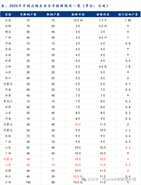 报告品种:铜 原文链接:https://mp.weixin.qq.com/s/eCYGlOyjbhPVc4TusOIqBQ Mysteel调研国内58家电解铜生产企业,涉及精炼产能1648万吨(含2025年新增产能)样本覆盖率98.93%得出:2025年9月国内电解铜实际产量114.98万吨,环比减少3.2%,同比增加14.48%。1-9月国内电解铜产量累计为1015.96万吨,同比增加14.64%。 数据来源:Mysteel 9月电解铜产量表现如期环比大幅减少,产量减少原因主要有:一是冶炼厂检修,据Mysteel调研来看,9月有4家冶炼厂将进行检修,涉及产能71万吨,同时10月部分检修企业也有一定的准备检修前降负降低产量;二是受再生铜政策影响,阳极板产出下降,不少企业反馈冷料或者再生铜原料难买产量有所下降。不过仍有部分新投产能继续释放带来一定增量。 另据调研企业的生产计划安排来看,2025年10月国内电解铜预计产量113.4万吨,环比减少1.37%,同比增加15.74%。1-10月国内电解铜预计产量累计为1129.36万吨,同比增加14.75%。 而10月电解铜产量继续维持下降,主因冶炼厂检修达到今年最高峰,据Mysteel调研来看,10月有8家冶炼厂将进行检修,涉及产能259万吨,检修幅度进一步扩大,加之再生铜政策影响仍在延续,部分冶炼厂因原料采购困难,同时铜精矿缺口扩大,铜精矿TC价格长期处于低位也使得冶炼厂后续难有高产表现;另外据调研来看,进入到四季度,多数冶炼厂表示今年产值目标基本能够完成,冲量任务降低,因此四季度并不会有明显的追产动作。 数据来源:Mysteel 总结预测 进入四季度的关键时间阶段,原料端依旧是市场焦点,全球第三大铜矿山印尼Grasberg矿山宣布因泥石流事件宣布暂时关停,后续分阶段重启,预计将在2027年才能达到事件前的水平,此次事件加剧了市场当前铜精矿供应短缺的局面;以往再生铜的补充也迎来了挑战,再生铜政策影响江西、安徽等再生铜阳极优势地区,使得市场上阳极板、冷料采买困难,且仍在延续当中。 10月份冶炼厂迎来检修最高期,尽管往年四季度是主要的铜冶炼厂的冲量阶段,今年铜价平均水平较高,使得多数铜企冲量任务低,加之原料的影响下,铜冶炼厂追产动作有限;因此,多种因素叠加下,10月电解铜产出或延续下降趋势。 七禾带你去调研,最新调研活动请扫码咨询 更多调研报告、调研活动请扫码了解 |