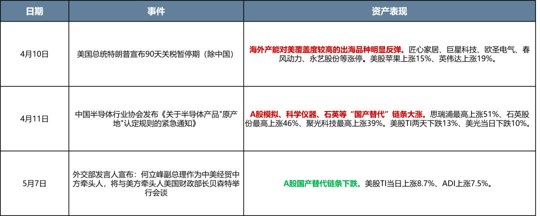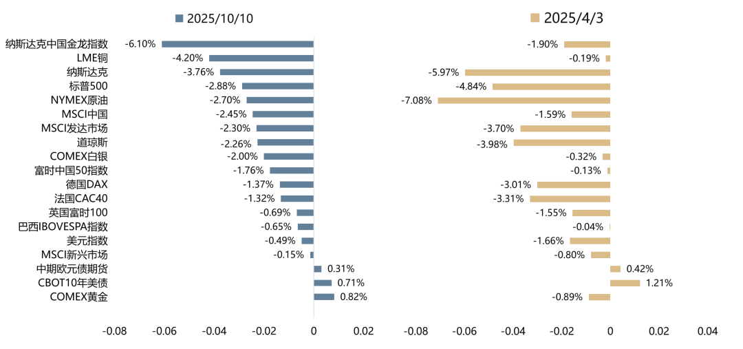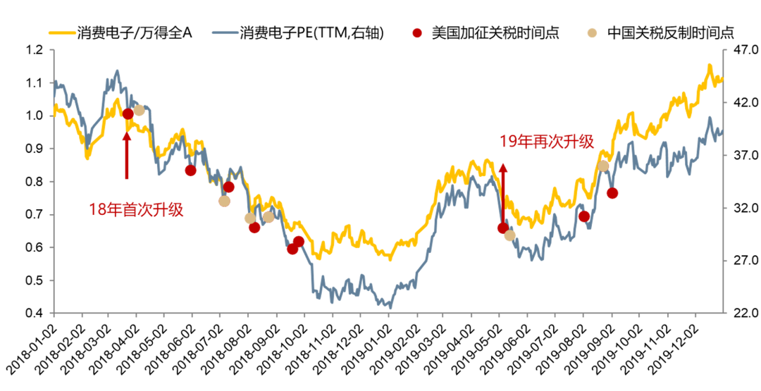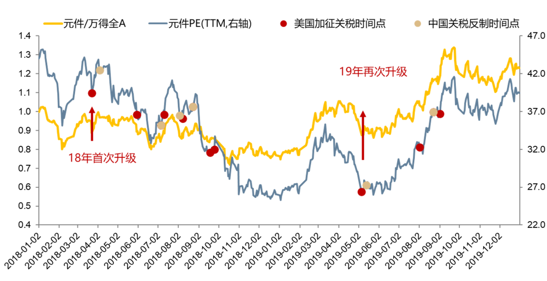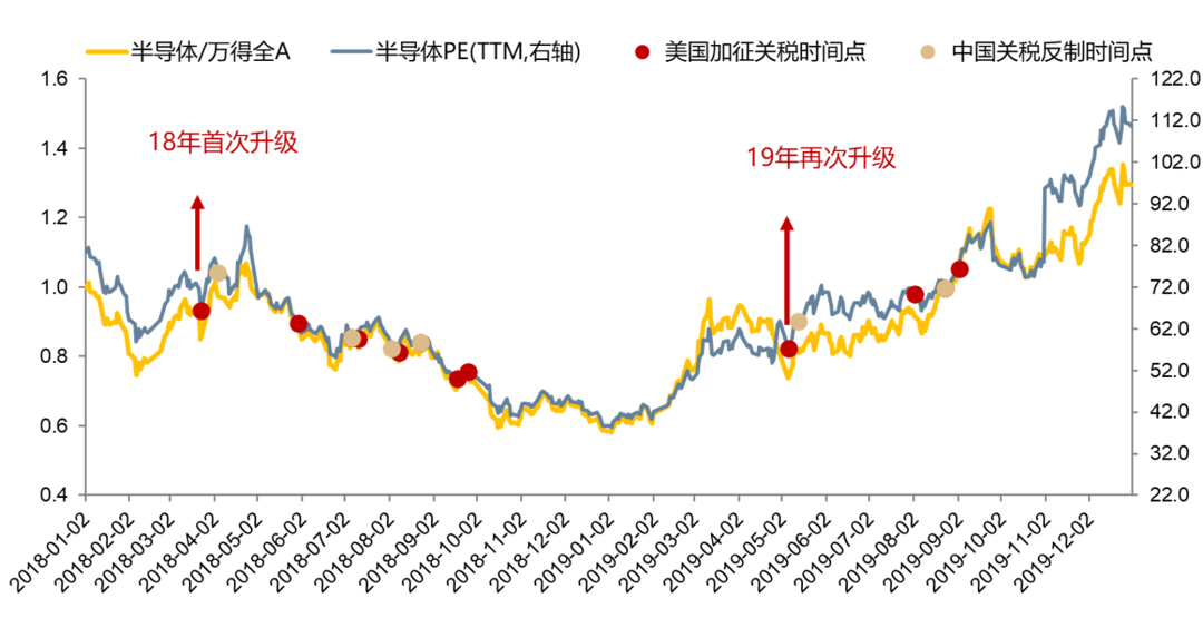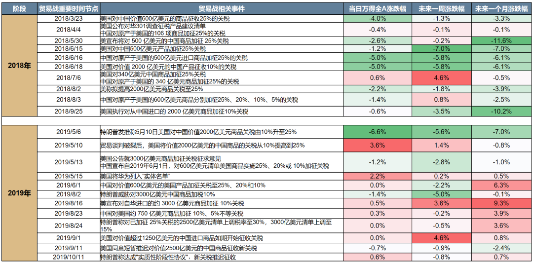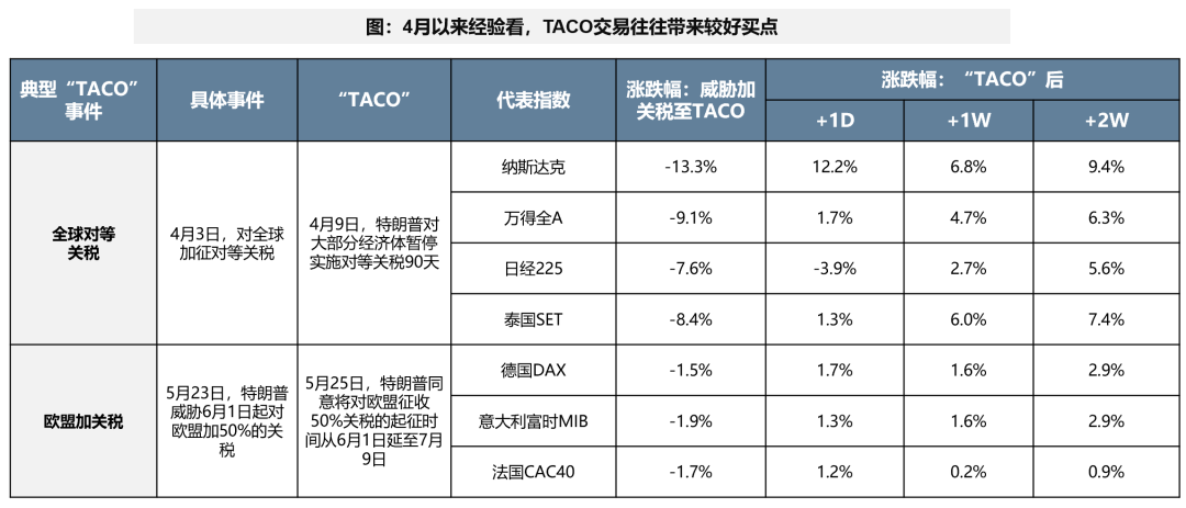 一、TACO交易带来再次买入的机会 北京时间10月10日深夜,特朗普推文引发全球大类资产波动,截止当日海外收盘,股债汇齐齐下跌。不过与特朗普4月份宣布全面对等关税相比,当日美股、美元指数、原油跌幅小于4月,中概股、铜价跌幅大于4月。 如何看待新一轮中美摩擦升温?与今年4月、18-19年有何异同?如何影响接下来的A股运行及行业配置? (一)这大概率仍是一次典型的“TACO交易” “TACO交易”特指因特朗普政府在贸易政策中反复无常的态度,而引发的市场交易策略。 与25年4月份相似,我们认为这大概率又是一次典型的“TACO交易”,即短期的威胁不代表终局,仍需观察下一步的斡旋形势。 1.今年4月中美关税升级已经证明,美方威胁的100%关税水平其很难承担且失去了经济学意义,此举更像是谈判前的极限施压 截止最新表态,特朗普演讲时提到“Haven& #39;t Cancelled Meeting Yet”,较当日推文表述有所缓和。考虑到今年4月份也出现过类似短期反复的陈述,投资者对此已习以为常。 事实上,在今年已经过去的四轮会谈之前(25年5月日内瓦会谈,25年6月伦敦会谈,25年7月斯德哥尔摩会谈,25年9月马德里会谈),都出现过双方制裁升级的局面。为争取谈判筹码,谈判前的制裁升级较为常见。5月日内瓦会谈前是关税不断加码、6月伦敦会谈前是围绕昇腾的制裁、7月斯德哥尔摩会谈前是围绕俄罗斯/伊朗石油问题的威胁与指控、9月马德里会谈前是围绕科技实体清单的制裁。9月以来,中国对美国挑起制裁的应对逐渐强硬、实质性反制措施不断出台。 2. 如果大概率是TACO交易,那么短期下跌就提供了买入的好时机 4月以来,全球TACO交易多次出现,包括特朗普威胁加关税后不断延期、威胁开除鲍威尔但又马上反复、威胁对铜加关税但又豁免精炼铜等等。事后来看,由TACO交易带来的下跌,往往是较好的加仓时机,无论是股市还是商品。 我们简单复盘4月以来两次关税方面的“TACO”交易:一是4月3日的全球对等关税,二是5月底威胁对欧盟加关税。在特朗普“威胁”后,股市可能有单日较大幅度的下跌。但“TACO”后,往往能于当日反弹,并较快的补缺口。此外,这几次的经验来看,特朗普从威胁到反复的间隔时间并不长,即下跌窗口期也有限。 (二)如果顾虑当前A股估值较4月更高,可以参考19年相较于18年的情况 在25年4月点评《不可胜在己,可胜在敌》中,我们提到,与18-19年的中美贸易摩擦相比,25年中美境遇已“今时不同往日”。中美经济形态及政策储备空间明显异位,这也为后续中方坚决反制提供了底气。 当前的市场环境与4月份的不同是——国内“宽货币+宽财政”的双宽基调更加明确,投资者相较于4月那一轮的“TACO交易”记忆犹新,已有应对经验;但差别在于股票市场攻守易势,当前估值水平较4月有所抬升。 事实上,在18-19年贸易摩擦升温的过程中,19年5月关税升级时期A股的估值水平也高于18年下半年。但考虑到: ①18年底国内政策基调转向,民企纾困、宽货币宽信用,19年宏观对冲信心增强; ②19年新一轮科技创新的产业周期逐步成型,4G向5G时代切换,国产替代半导体、无线耳机消费电子、5G基站建设加速。 因此,从市场表现来看,与18年初次受到关税冲击、持续阴跌不同,19年5月虽然A股的估值较18年下半年已有明显抬升,但指数层面已经适应冲击并明显脱敏,在个别摩擦节点股市甚至不再下跌、反而阶段性上涨。 且中期产业趋势更加明朗的行业,例如无线耳机渗透率快速提升带动的消费电子、5G基站加速建设受益的PCB、科技封锁受益的国产替代半导体、信创受益的国产软件,即便在19年春季躁动阶段已有一波明显的估值抬升,但在19年5月之后股价走势也更多定价产业逻辑,与贸易冲击脱钩。 (三)基于跌破20日线的复盘,这次如果判断是TACO,那wind全A指数在20-30日线之间有支撑 如果下周市场出现短期波动,指数再次下探20日均线,短期走势如何看待? 根据我们前期的报告《6轮牛市99次跌破20日均线后是如何演绎的?》,牛市中Wind全A指数跌破20日均线的情形并不罕见,历史上一共出现过99次。随后的复盘经验显示: 1.跌破20日均线后,市场在T+5、T+20、T+60、T+180胜率分别为60%,67%,79%,92%。即短期消化后,市场大多会重回涨势; 2.跌破20日均线后,平均回调天数在6.4天,平均调整幅度为2.9%,即继续下跌空间有限; 3.少数情形下(11/99次),如果出现贸易摩擦/外围波动/监管政策收紧等进一步的利空事件,指数在跌破20日均线后有可能继续下跌,平均再回调11个交易日,平均回调10%,也不会结束牛市的进程; 4.因此,如果我们判断这次大概率是又一次的“TACO交易”,那么Wind全A指数在20日-30日线之间应该存在支撑,短期不必过于恐慌。 (四)4月行业轮动复盘以及对当前的判断 落实到结构,如果此次关税反复对股价形成冲击,行业轮动可能如何演绎?应该抄底哪类资产?我们复盘4月脉络得到一些经验借鉴。 用几句话总结4月行业轮动经验:行业轮动分为两阶段:先交易不受关税影响的错杀品种(内需/非美出口链)、后交易关税高相关品种(国产替代/对美出口链)。无论是哪个阶段,关税交易带来的行情持续性均不强,但基本面向上品种会是好买点。 第一阶段:4月大盘砸坑后率先反弹:不受关税影响的错杀品种——内需、非美出口链。 4月3日/7日大盘砸坑后,市场率先交易与关税无关的品种,多数品种在几个交易日内补上缺口:一是内需品种,如即买